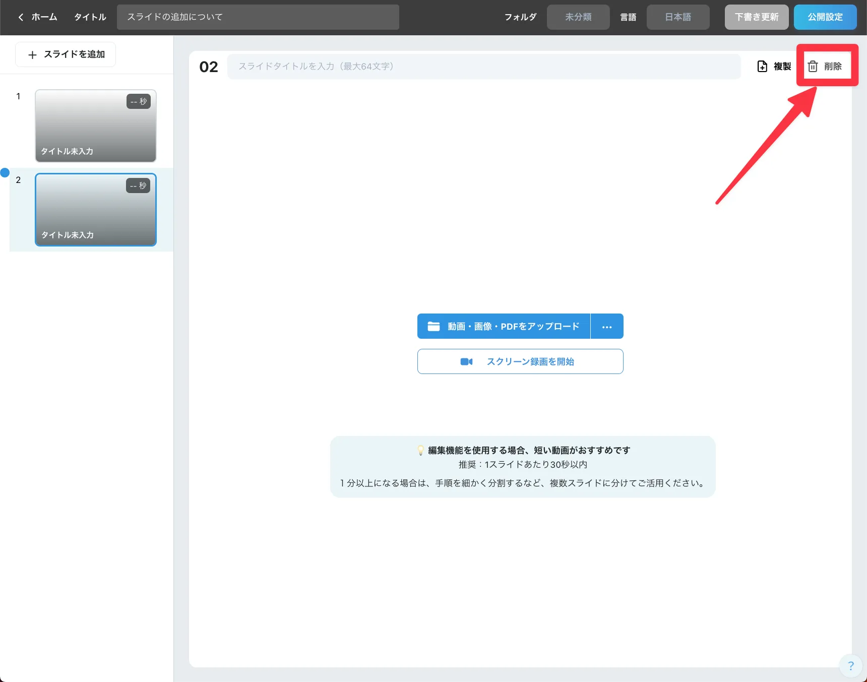 すると、左下に「スライドを削除しました」と表示され、スライドが削除されます。