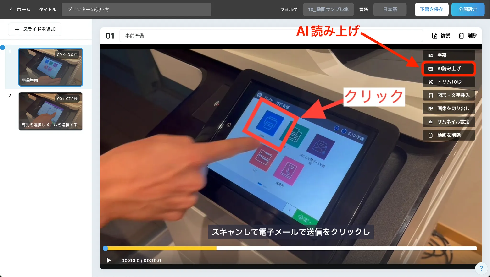 画面右上の編集メニューから、上から 2 番目の「AI 読み上げ」をクリックします。