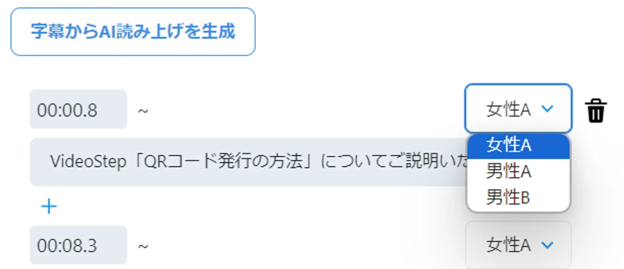 VideoStep の AI 読み上げは SSML(Speech Synthesis Markup Language)に対応しています。SSML を使って読み上げ速度を調整できます。※ 音声選択機能(男性 A/B ボイス切替)と SSML 設定は同時利用できません。