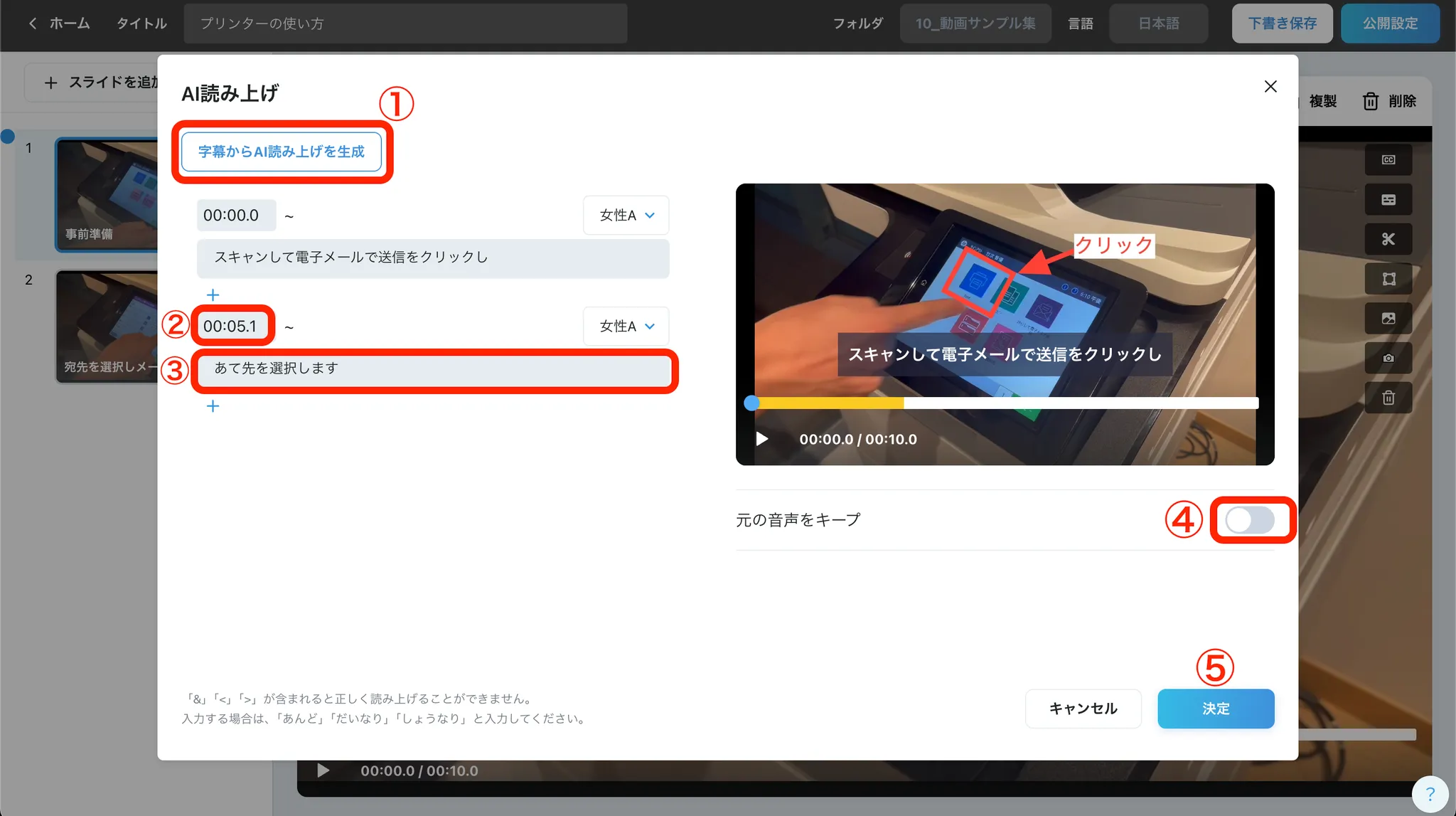 ① 字幕から読み上げを生成:字幕として設定した内容をそのまま読み上げます