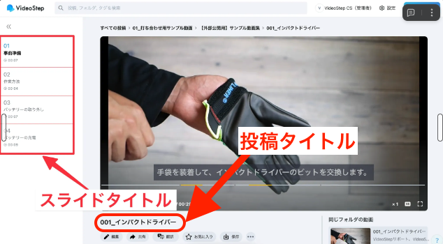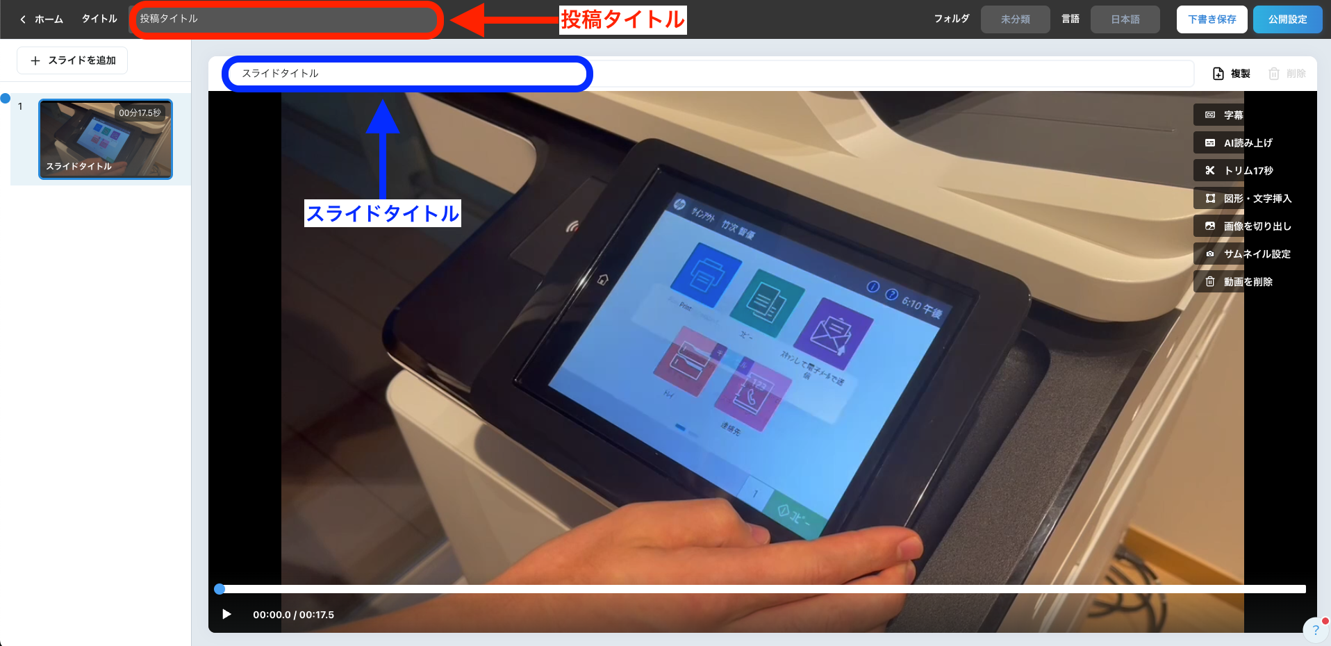 VideoStep では投稿タイトルとスライドタイトルの2種類を設定できます。