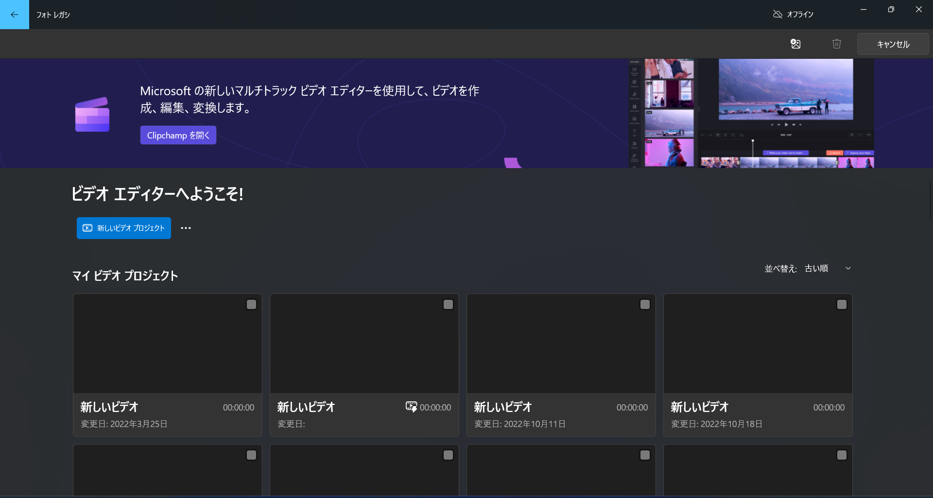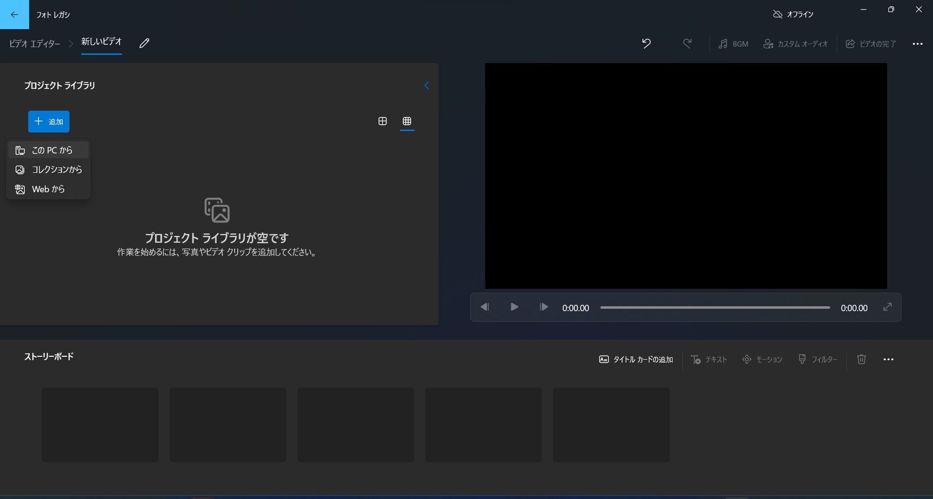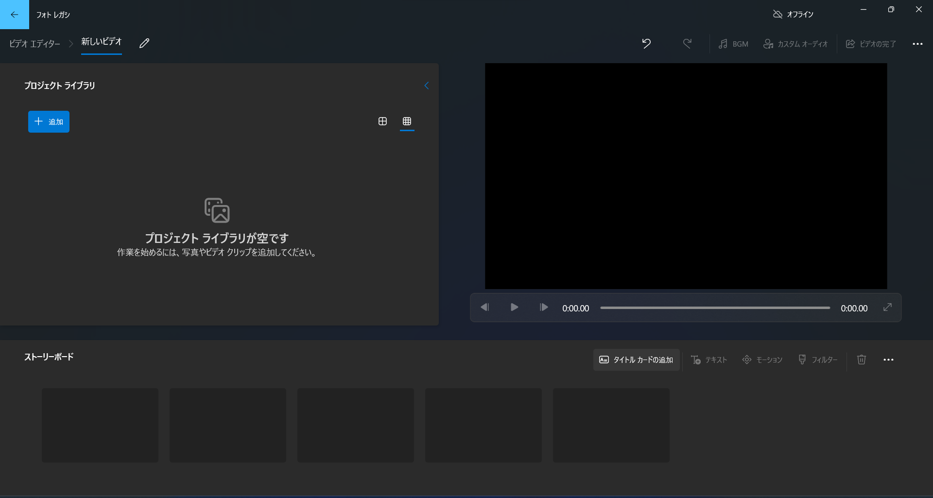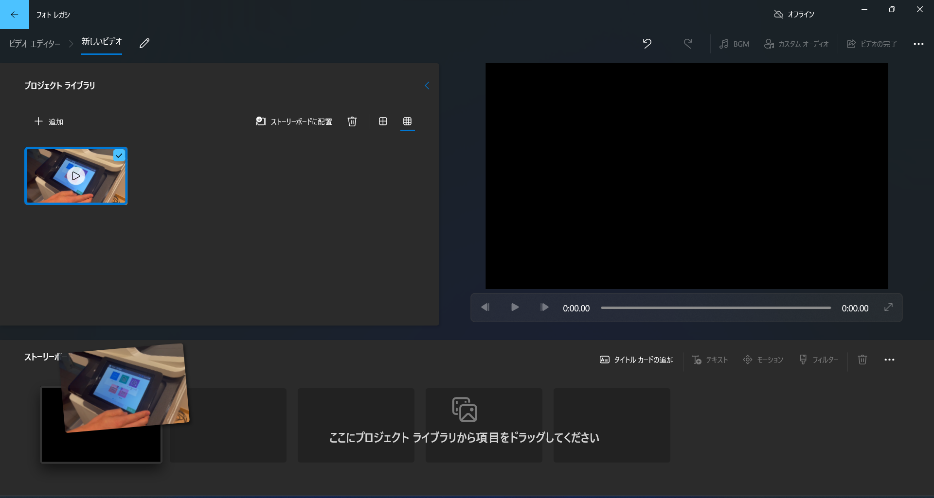ビデオライブラリに編集したい動画を追加します。 ※元の動画ファイルそのものを編集するわけではありません。Windows フォトのプロジェクトに動画を挿入→編集→エクスポートですので、元の動画も残ります。