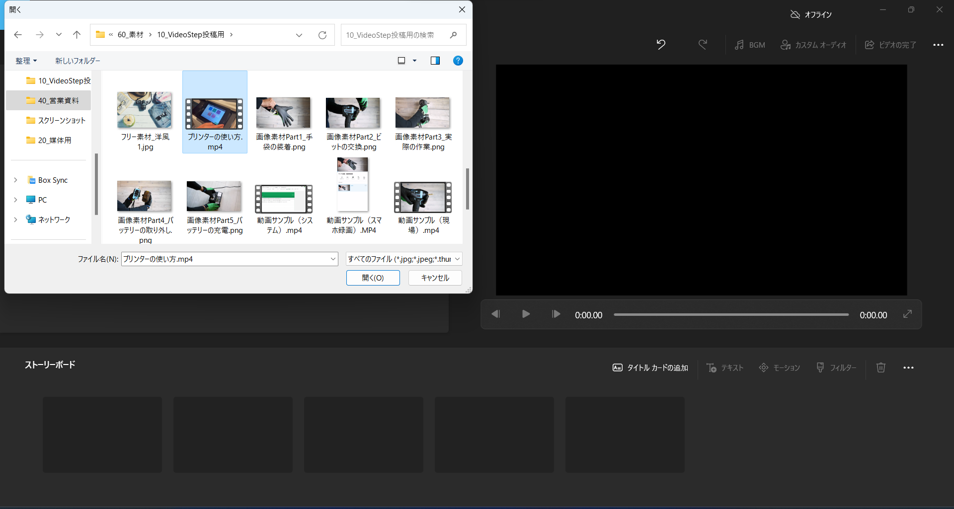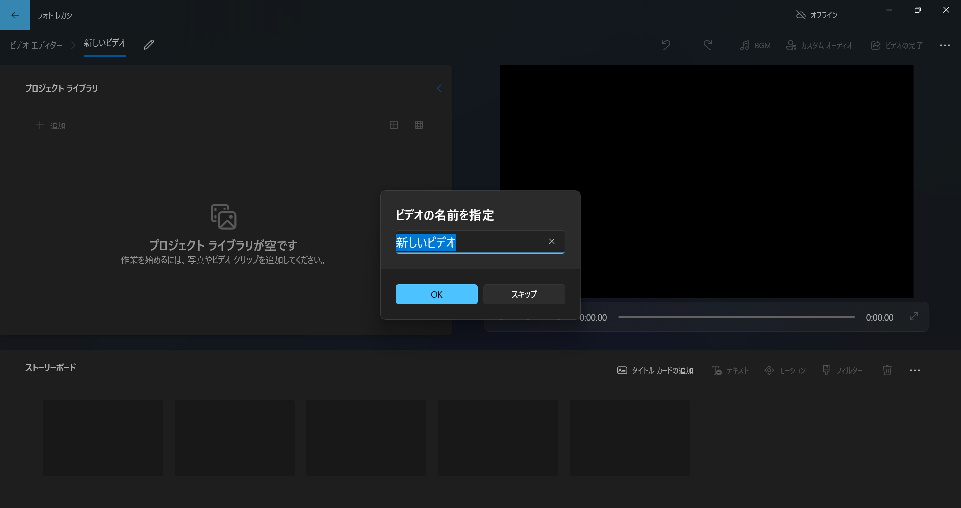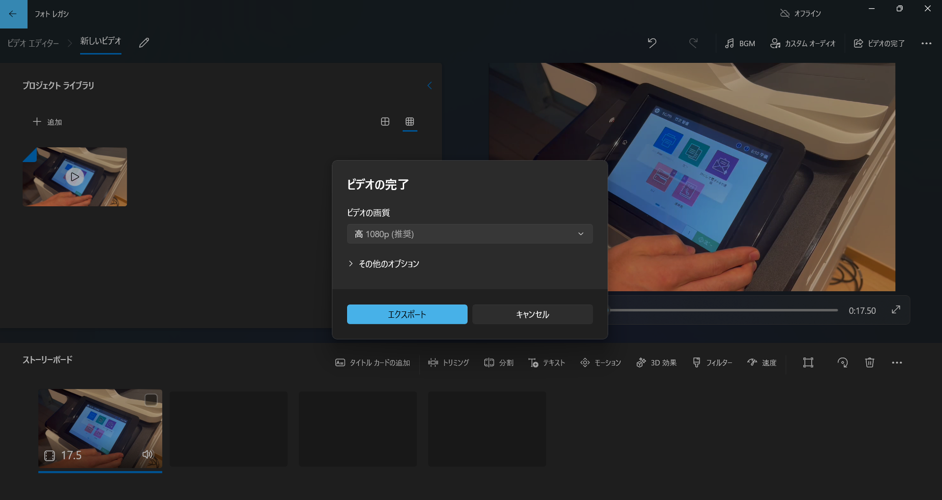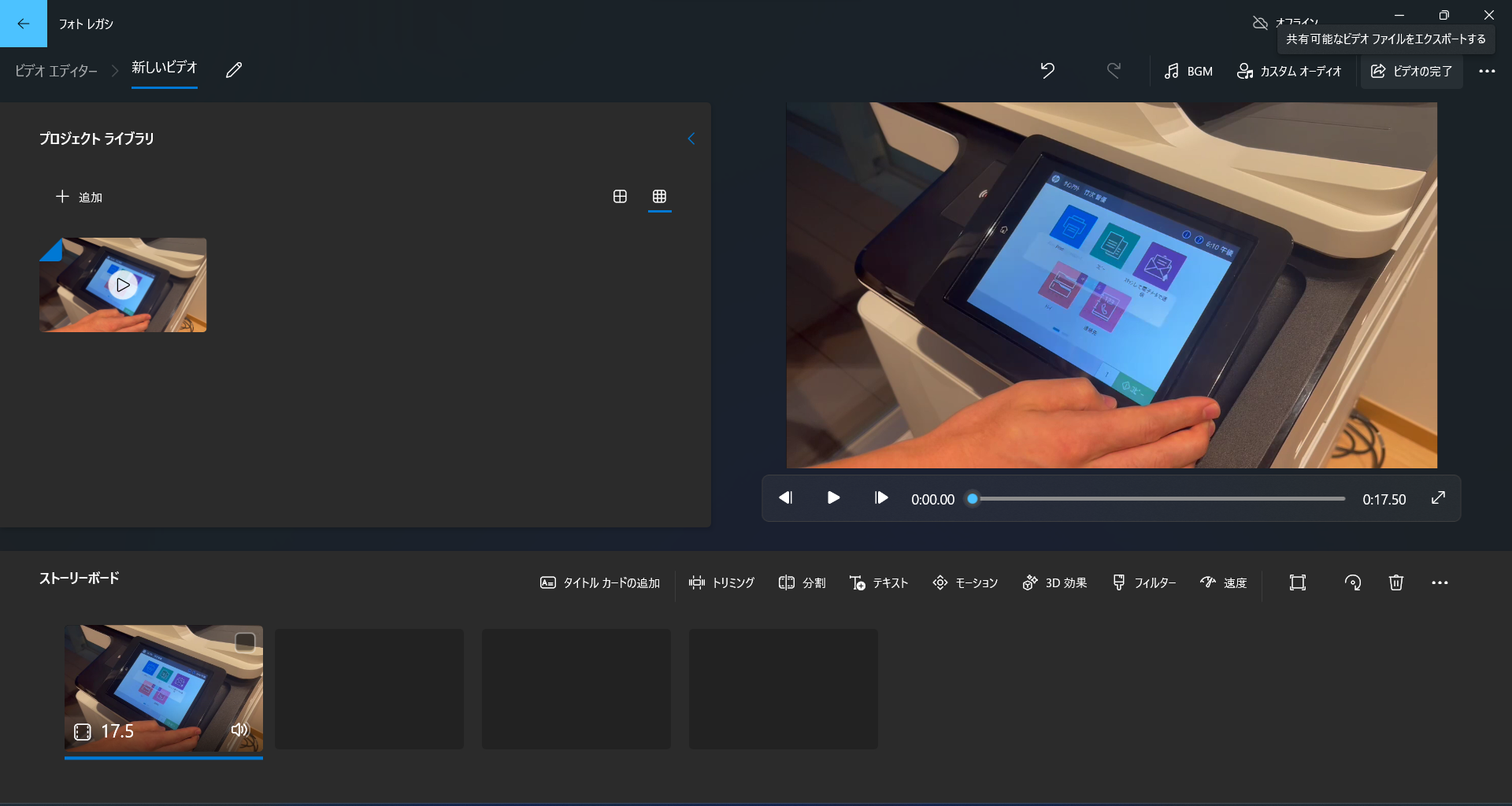 ビデオライブラリに編集したい動画を追加します。 ※元の動画ファイルそのものを編集するわけではありません。Windows フォトのプロジェクトに動画を挿入→編集→エクスポートですので、元の動画も残ります。