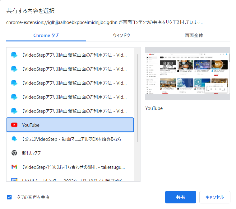 Chromeタブ録画を選び、画面左下の「タブの音声を共有」にチェックを入れると対象タブで発生する音声も録音可能です。