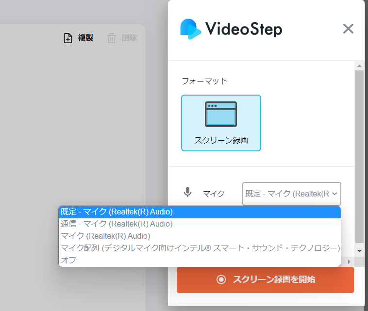 システムの音声等のPC内の音声については、マイクからの録音はできず、オレンジ色の「スクリーン録画を開始」ボタンを押した後に表示される共有画面での設定が必要になります。