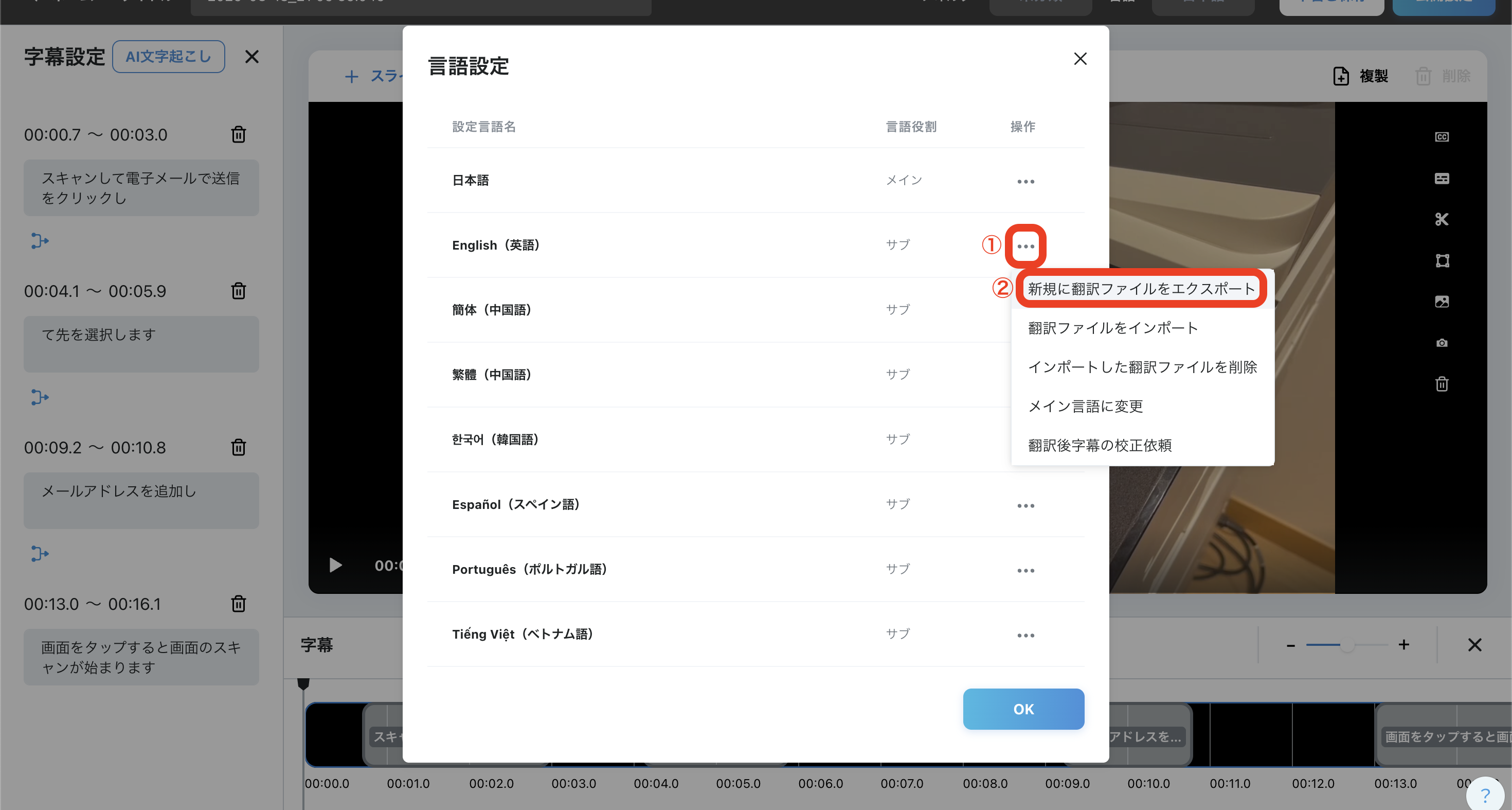 編集画面の「メイン言語」設定画面から字幕データをCSVで出力する