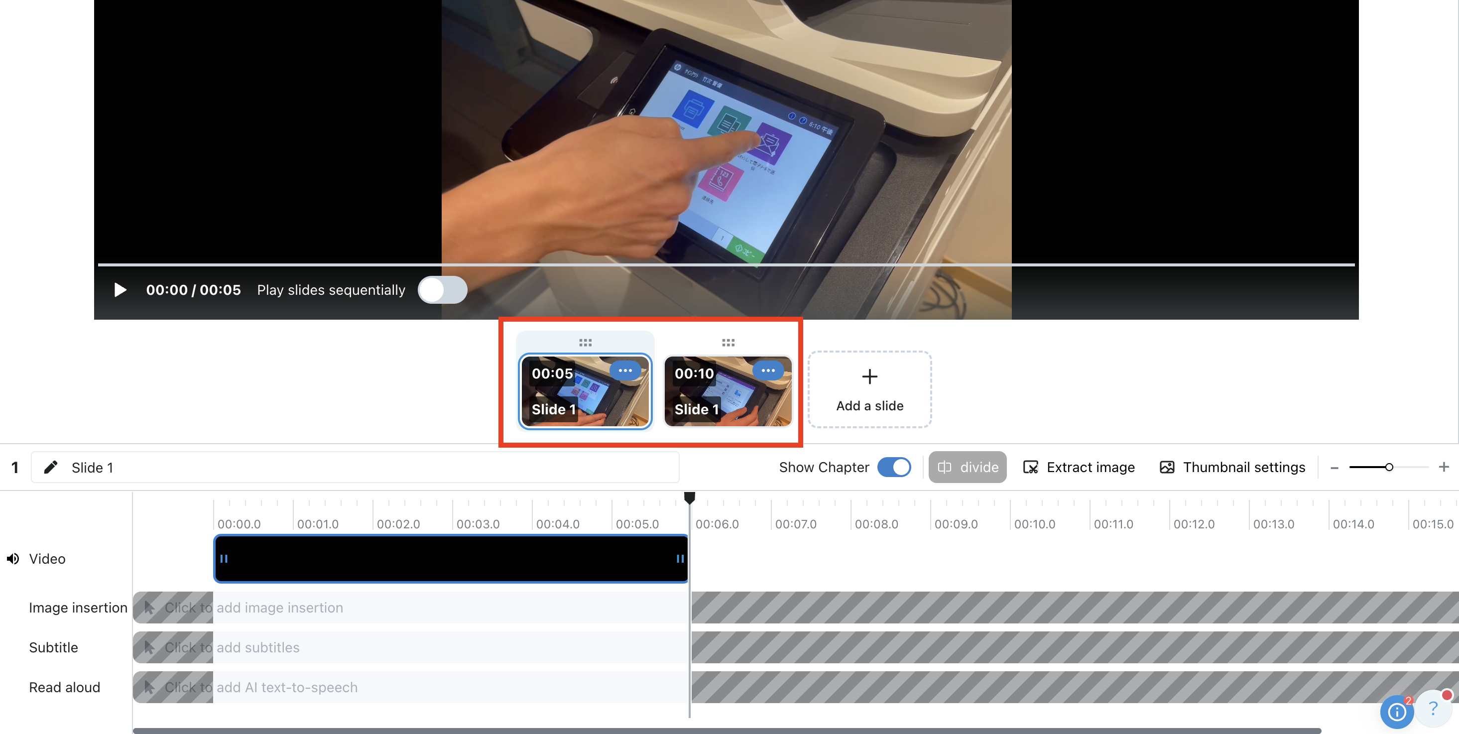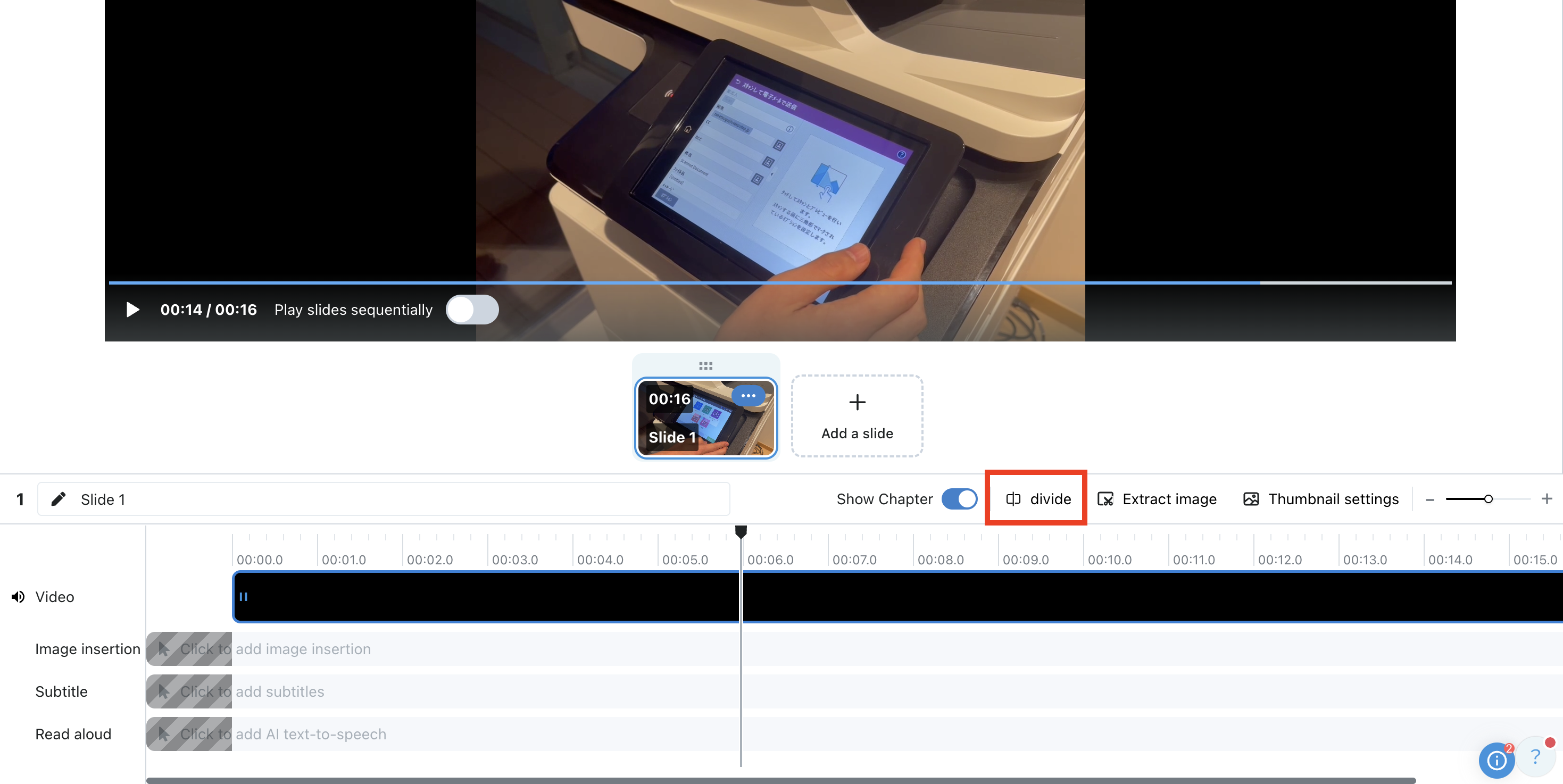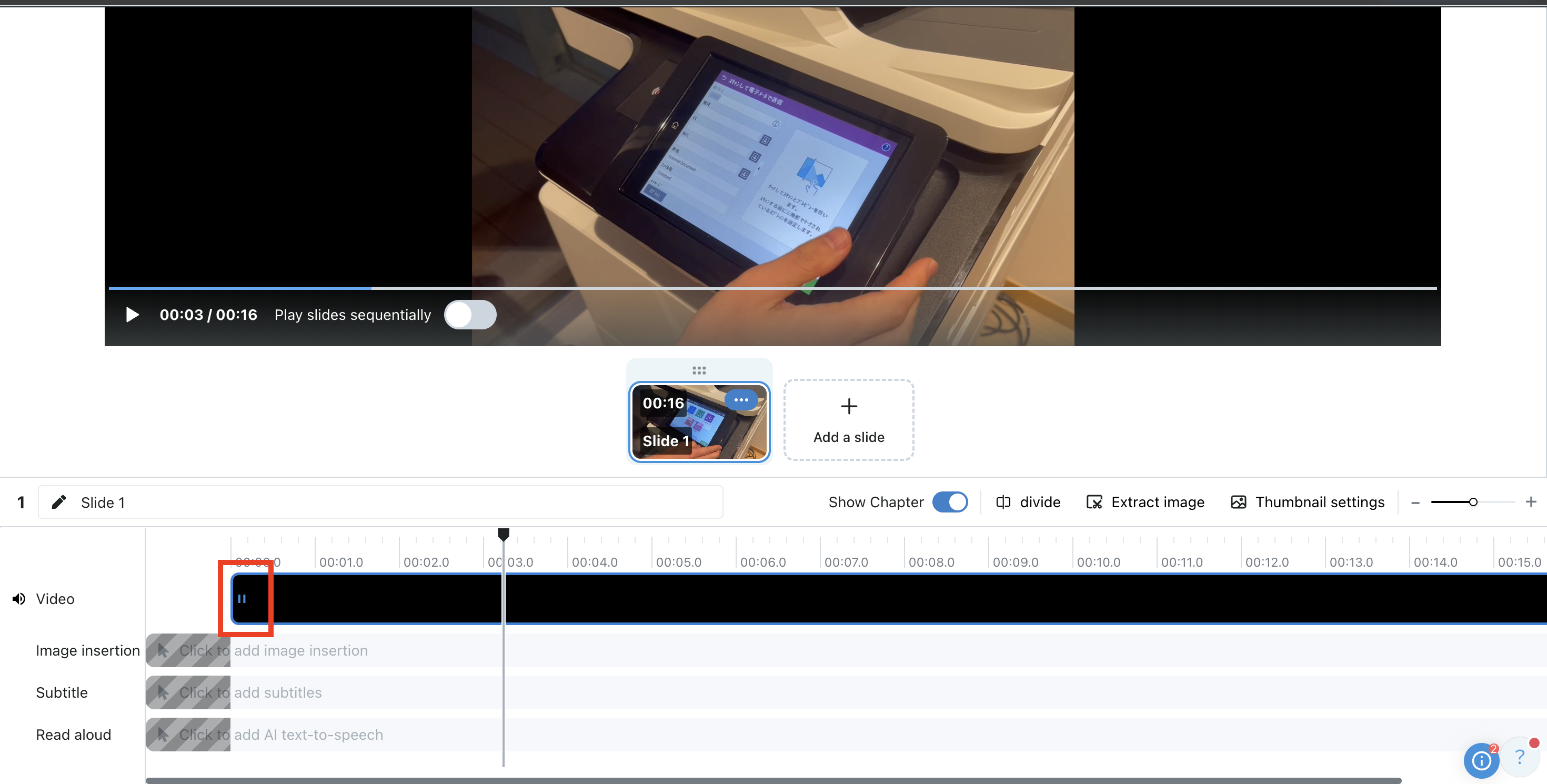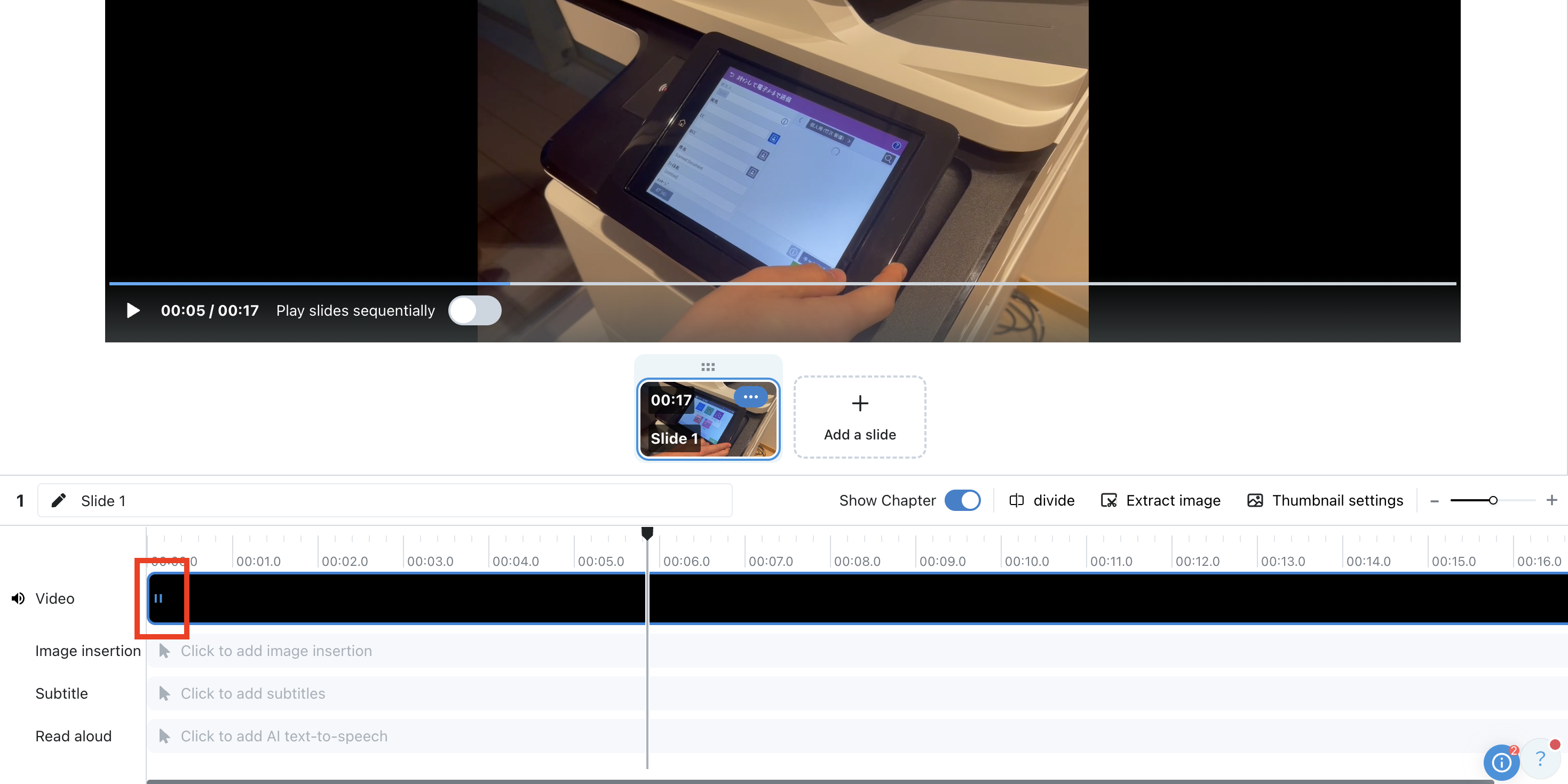 Move the blue handles on both sides of the “Video” timeline to trim and remove unnecessary parts.