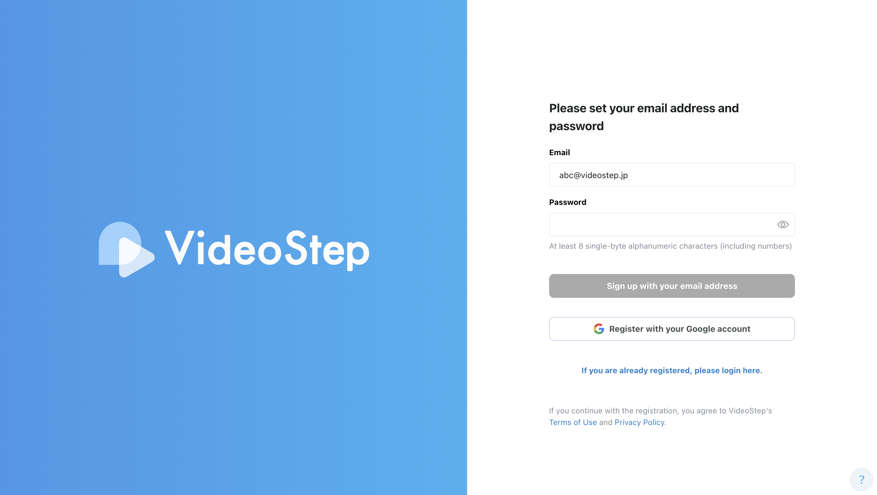On the registration screen, set your email address and password.