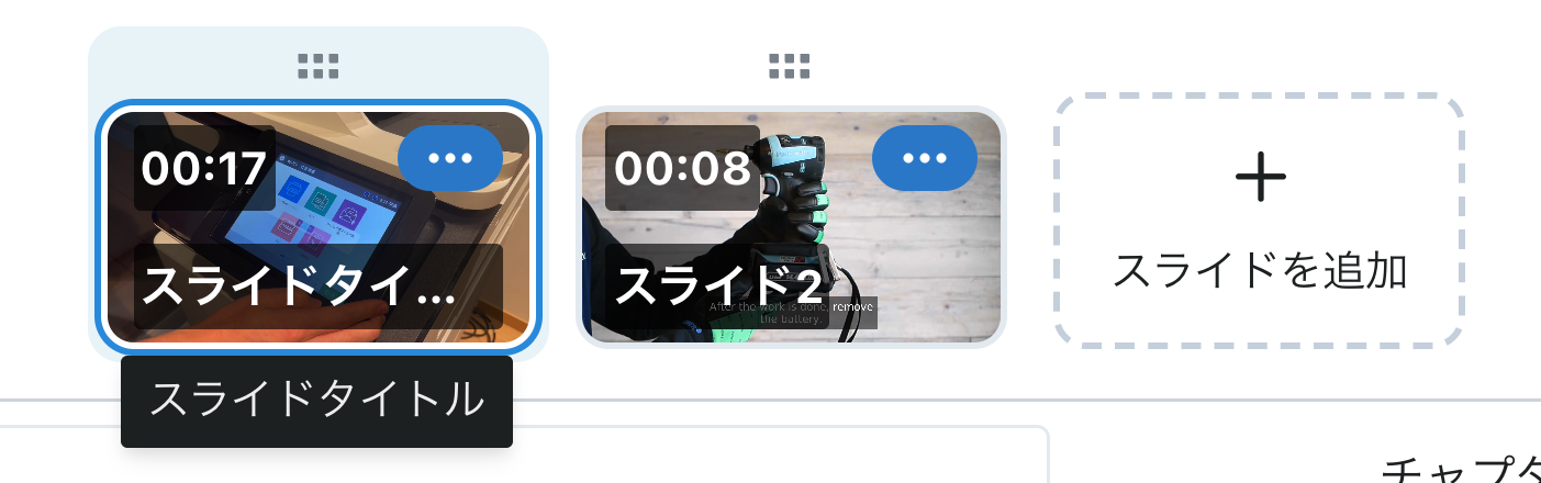 VideoStepの編集画面には、スライドの一覧が表示され、スライドのサムネイルは動画のアップロード時に自動的に設定されます。サムネイルを設定することで、スライドごとにどのような作業を行っているかが一目で分かりやすくなるほか、投稿の情報をPDFで出力する際にも併せて利用されるケースが多くございます。スライドのサムネイルは編集画面中央に横並びで表示されます。