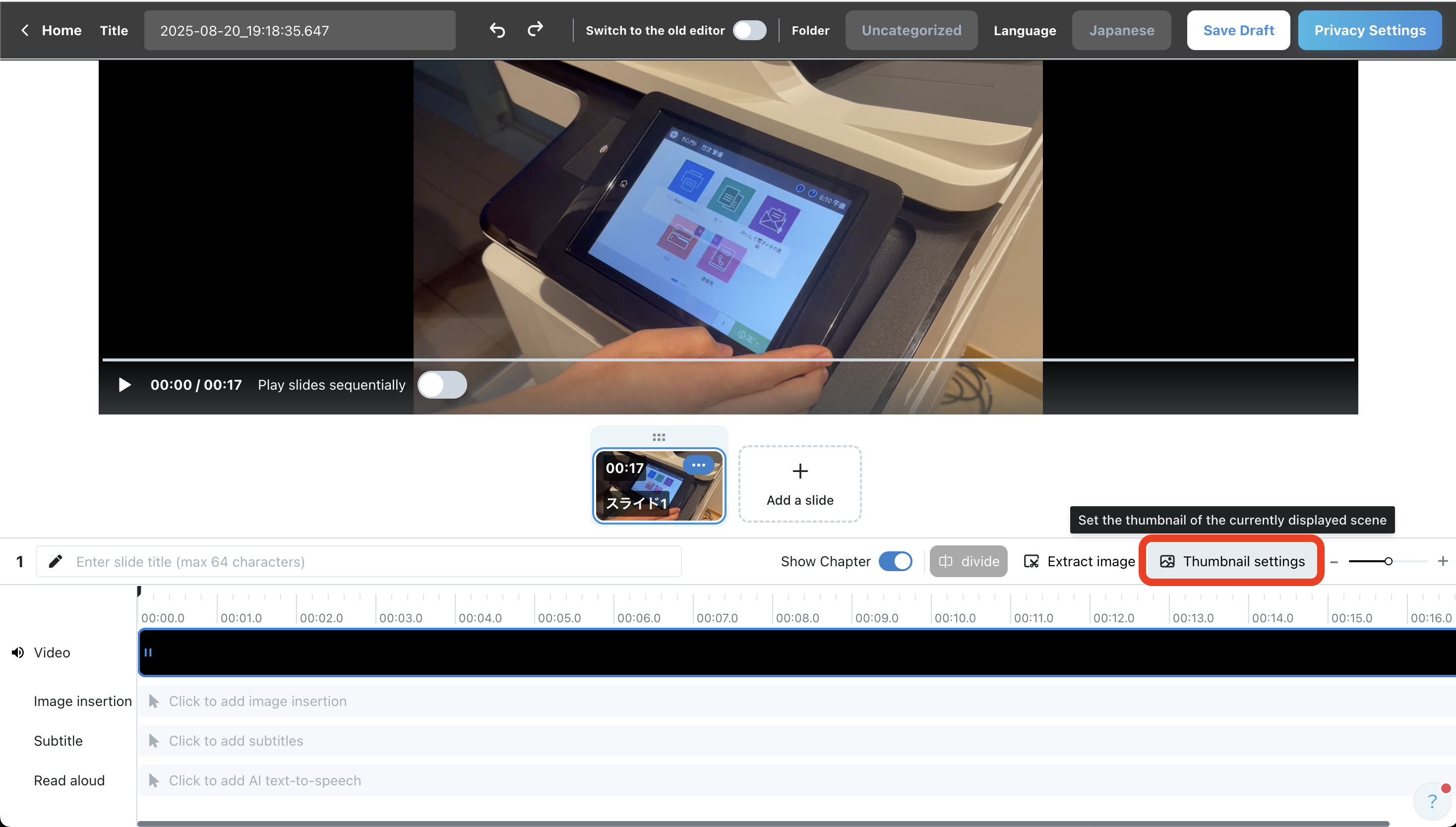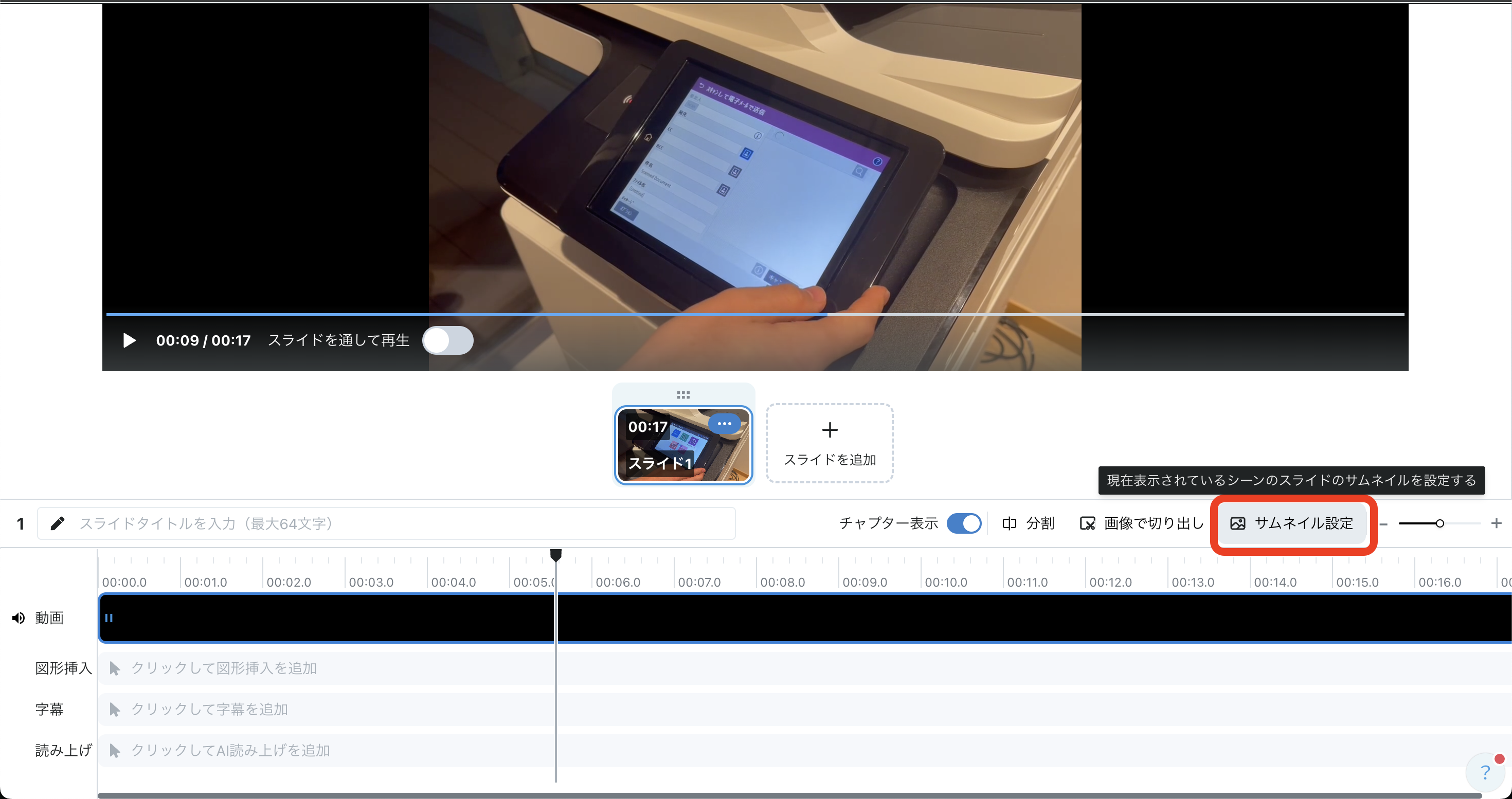 「サムネイル設定」では、スライドにアップロードした動画内の任意の画面を、スライドのサムネイルとして設定することができます。操作手順は以下のとおりです。