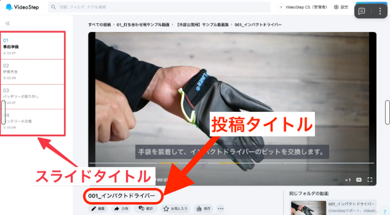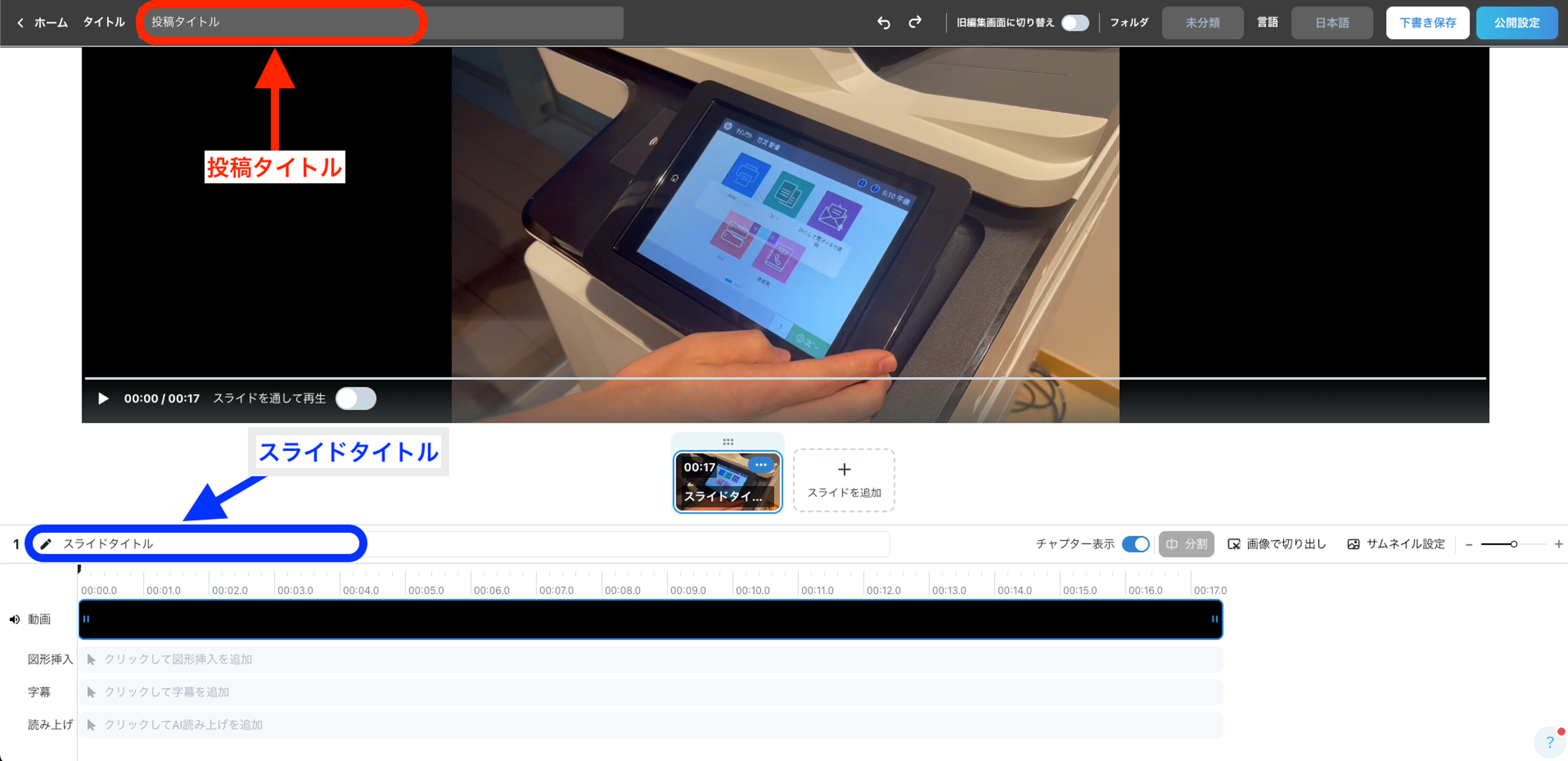 VideoStep では投稿タイトルとスライドタイトルの2種類を設定できます。