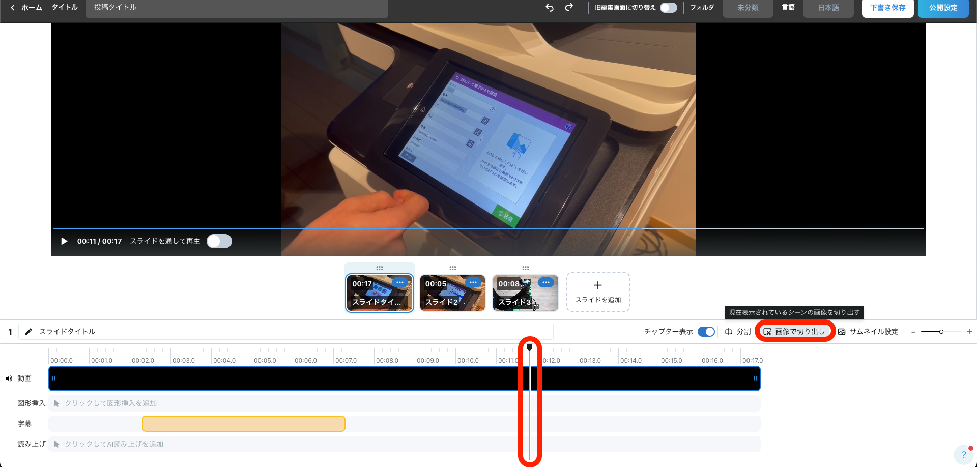 左下に「動画から画像を切り出しました」と表示され、画像スライドが次のスライドに追加されます。