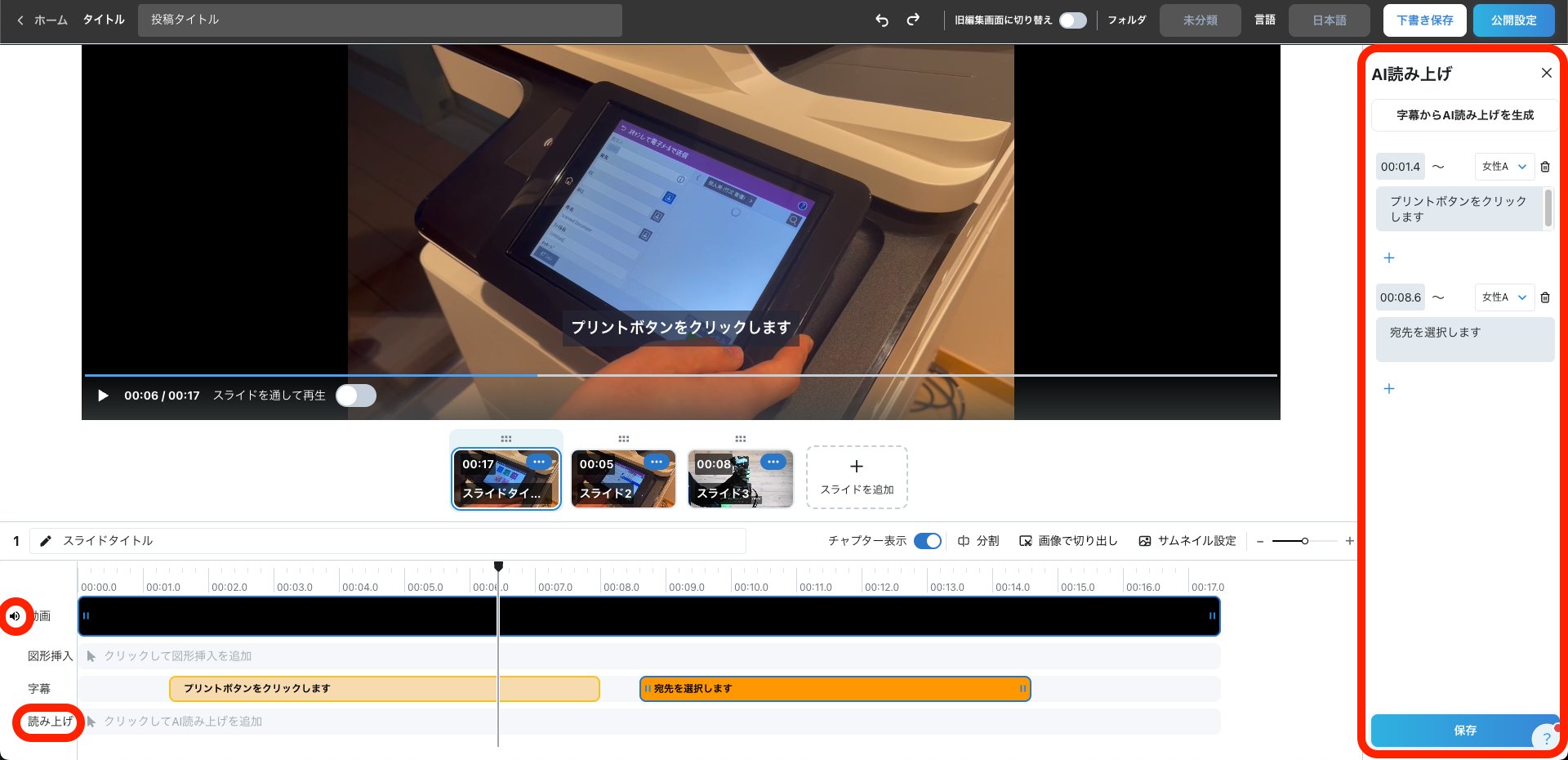 • 画面下部の「読み上げ」のタイムラインをクリックします。