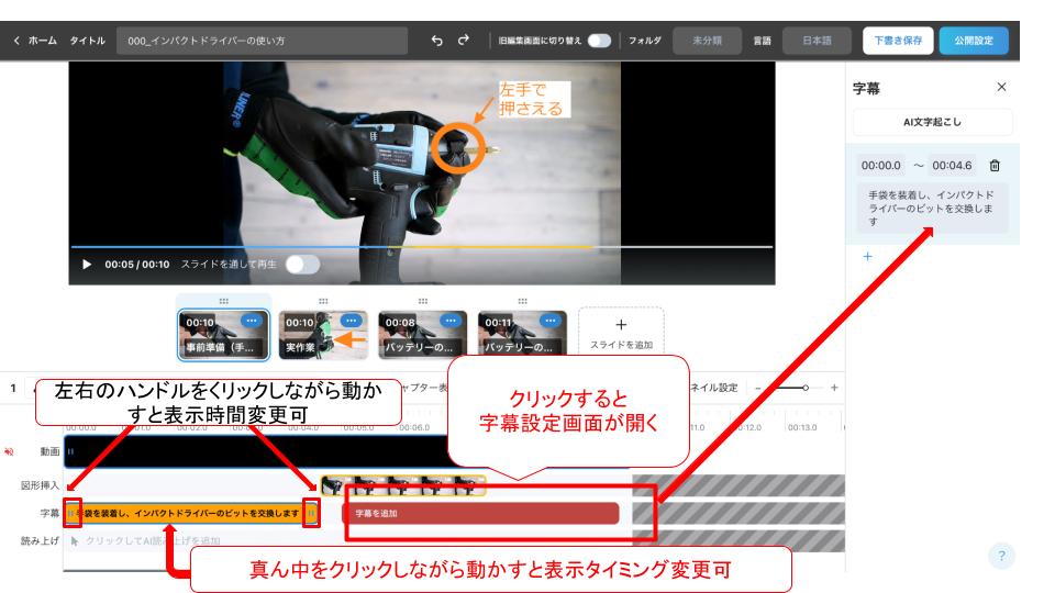 1. 画面下部の字幕タイムラインををクリックし、右側の入力欄にテキストを入力。