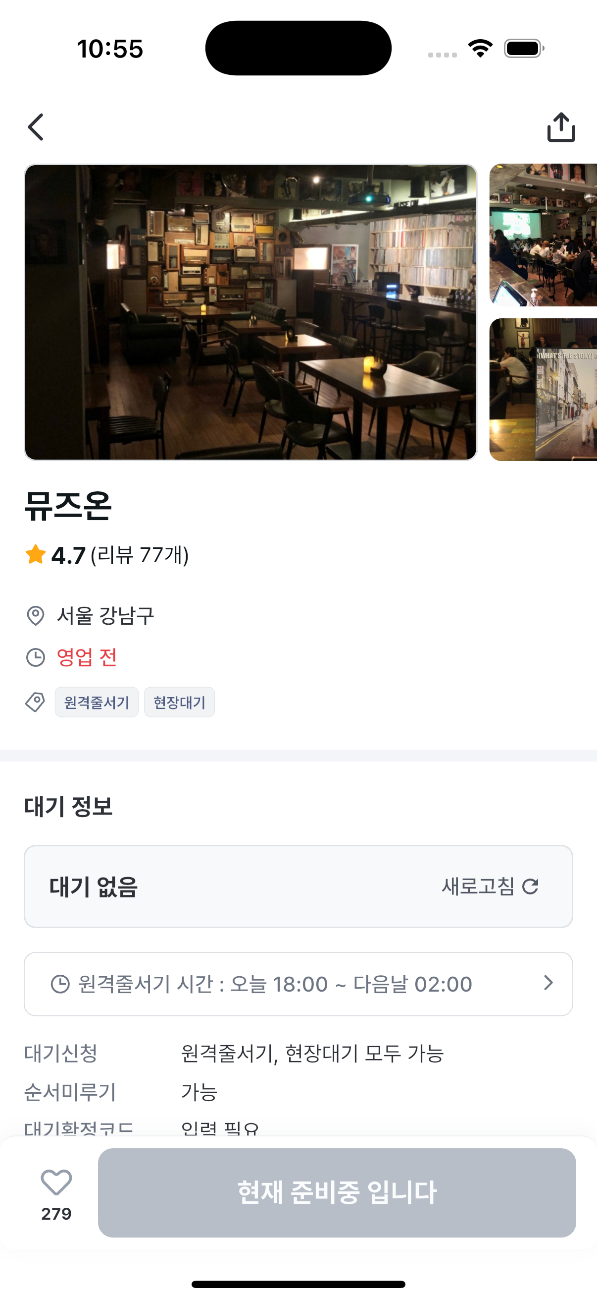 음식점 상세 화면에서 모든 대기열의 대기 현황을 볼 수 있습니다.