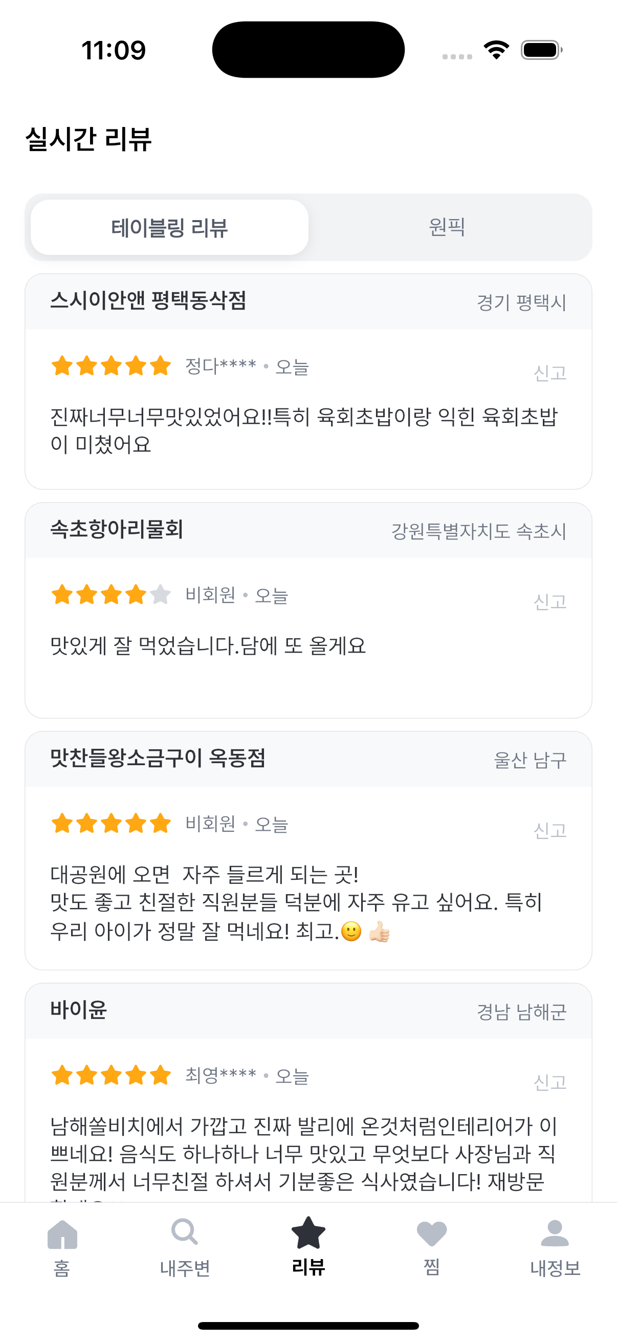 그동안 테이블링에서는 음식점 상세 화면에서만 리뷰를 볼 수 있었어요. 이번에는 우연히 리뷰를 둘러보다가 발견한 맛집에 방문해보셨으면 하는 마음에 좋은 평가를 받은 리뷰를 찾아 살펴볼 수 있게 '리뷰' 탭을 만들었어요. 테이블링에서 식사 후에 남겨주신 리뷰와 테이블링 사용자의 원픽 매장을 찾아보시는 것도 재밌을 것 같아요. 그리고 발견한 음식점을 '관심매장'으로 폴더에 담아보세요