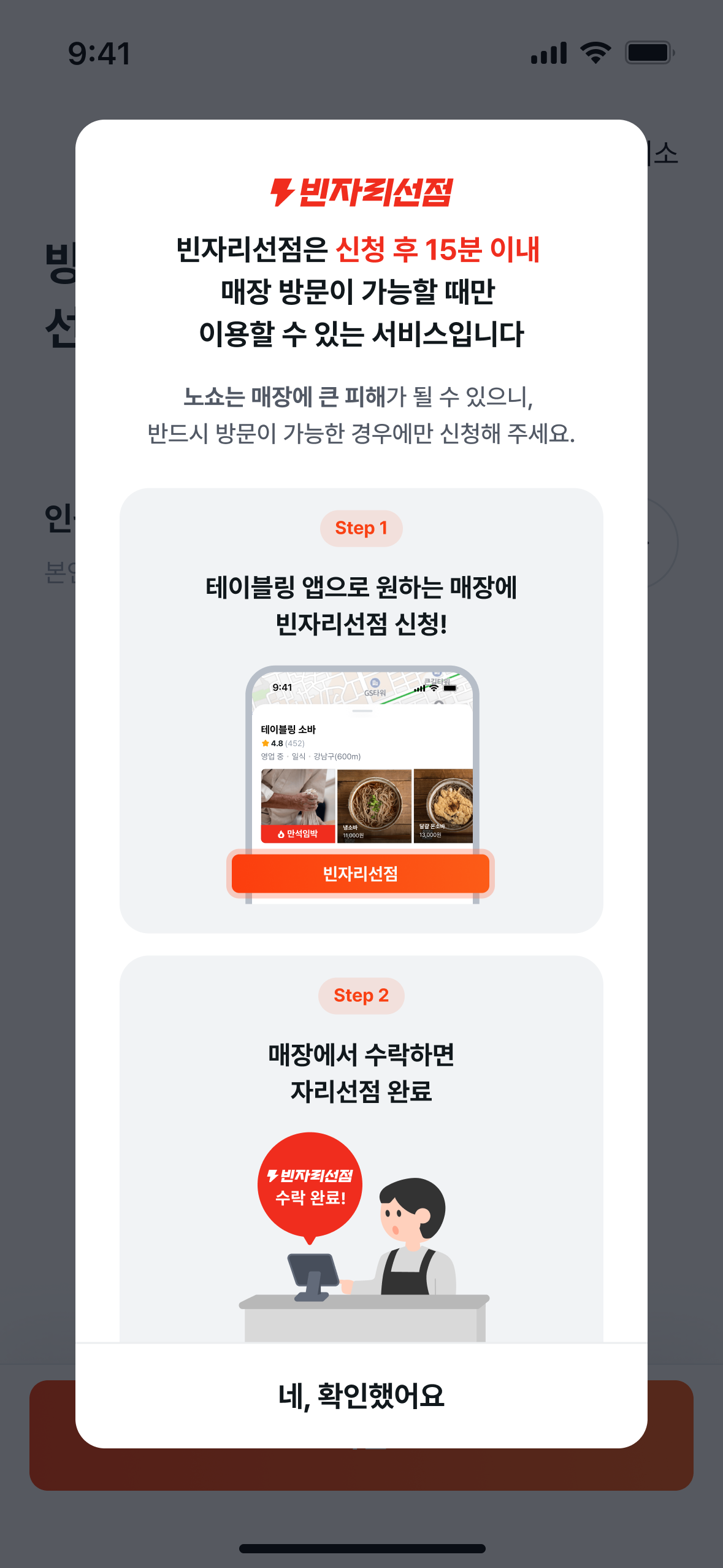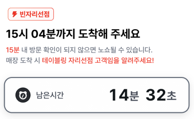 빈자리선점 서비스의 개념과 이용 과정이 헷갈린다는 피드백이 있어, 빈자리선점 서비스 이용 과정에 필요한 안내를 더욱 명확하게 개선했어요. 이제 신청 전 단계와 매장 수락 후 단계에서 각각 필요한 이용 방법과 방문 안내를 보다 쉽게 확인할 수 있어요.
