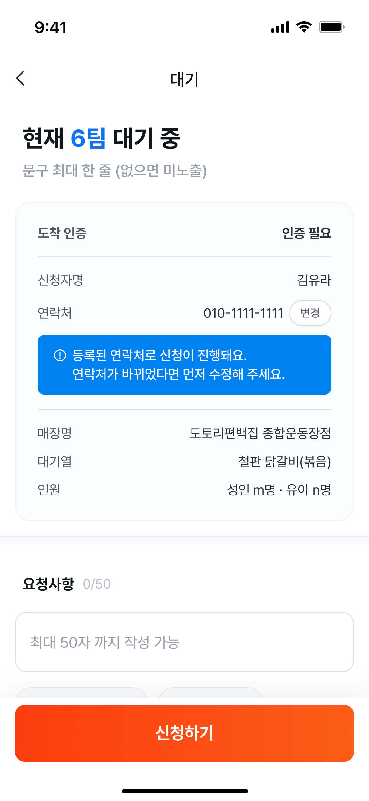 매장에서 순서가 되어 전화를 드릴 때 예전 번호로 등록되어 있어 아쉽게 순서를 놓치거나 입장이 취소되는 안타까운 상황이 있었어요. 잘못된 번호로 연락이 가서 연락이 닿지 않아 오랜 시간 기다리신 보람 없이 대기가 취소되는 불편을 줄여드리고자 연락처 확인 기능을 추가했어요.