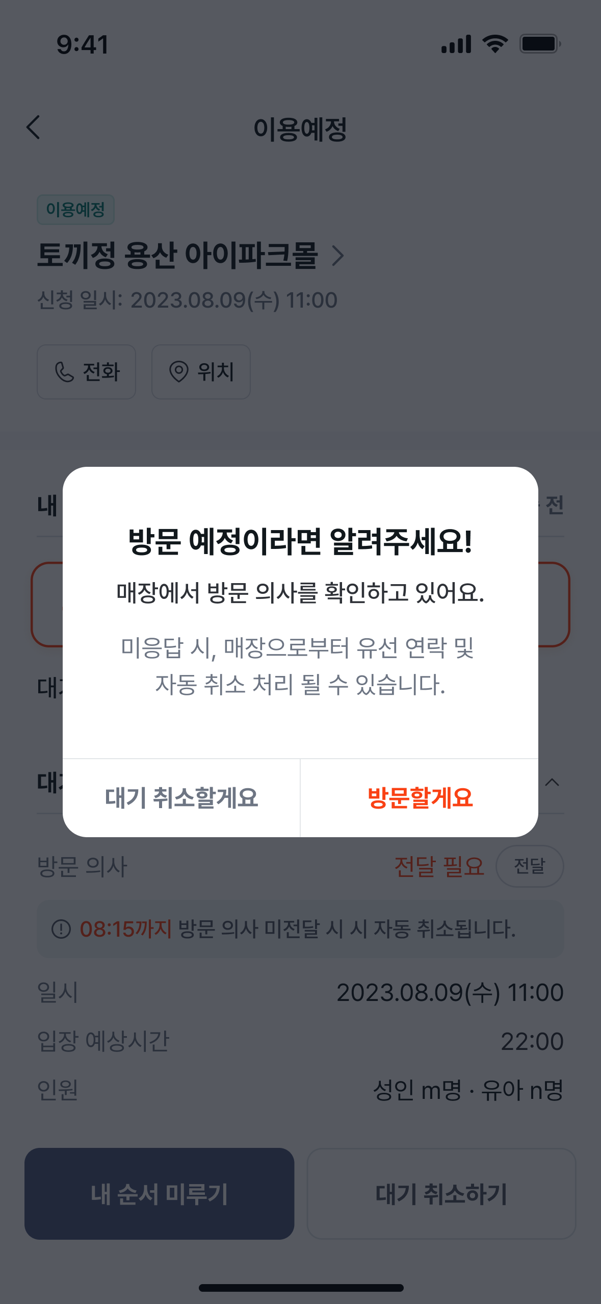 입장 순서가 가까워졌을 때, 매장에 방문 여부를 미리 전달할 수 있는 '방문 의사 확인' 기능이 추가되었어요. 이제 앱을 통해 나의 방문 의사를 간편하게 표시할 수 있어, 매장과 고객 모두가 더 확실하게 입장을 준비할 수 있어요.