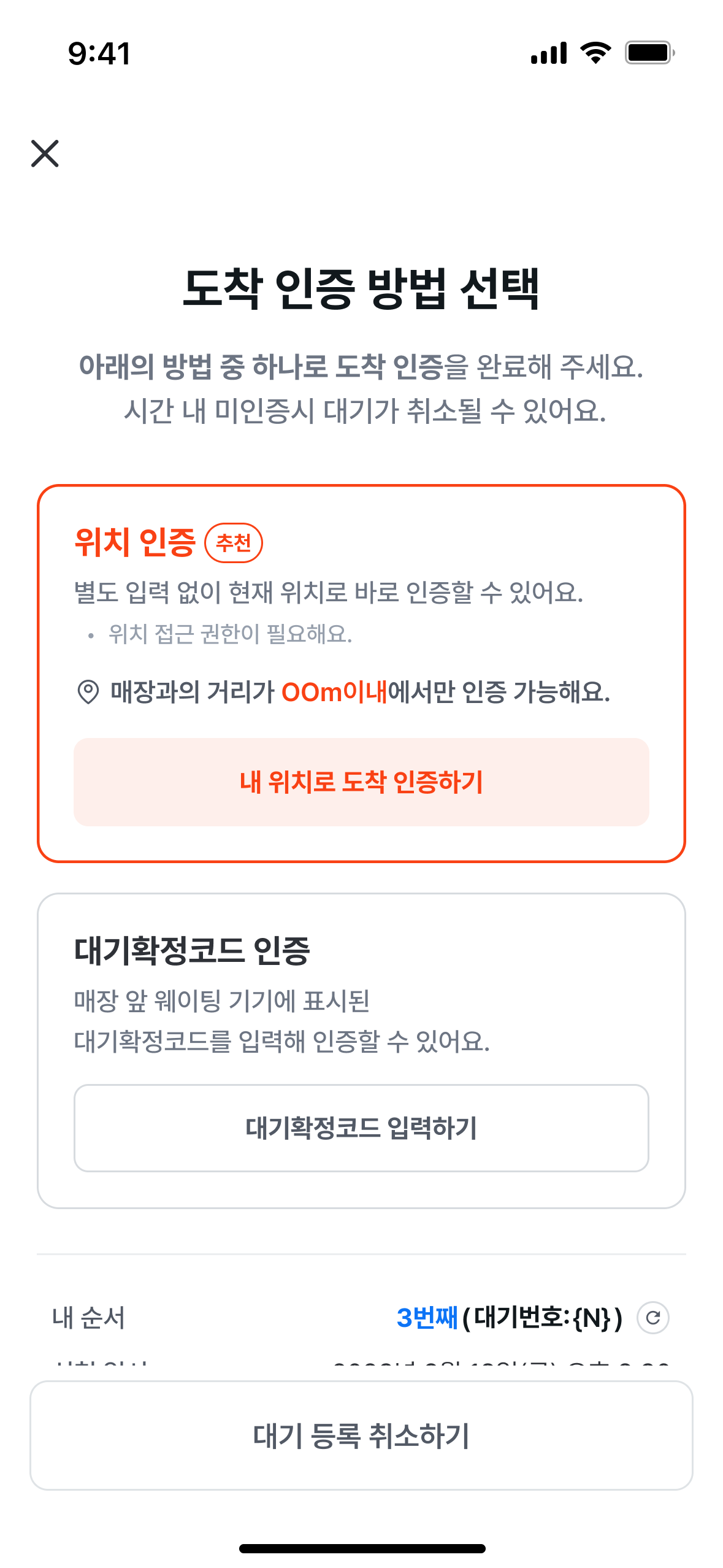 혹시 원격 줄서기 후 매장에 도착하여 대기확정코드를 확인하기 위해 입구에서 코드를 찾거나 직원분께 물어봐야 했던 경험이 있으신가요? 이제 매장 근처에 도착하면 내 위치 정보를 기반으로 간편하게 '도착 인증'을 할 수 있어요. 이제 코드 입력 없이도 위치 정보를 기반으로 내가 도착했음을 매장에 바로 알릴 수 있어, 혼잡한 매장 앞에서도 당황하지 않고 더 빠르고 스마트하게 입장 준비를 끝낼 수 있어요!