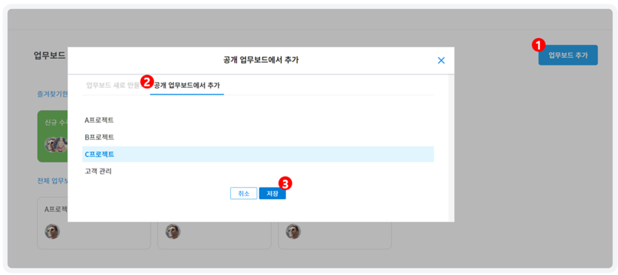공개된 업무보드의 경우에는 아래의 절차를 통해 조회하거나 추가할 수 있습니다.