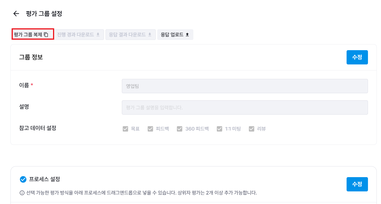 평가 그룹 설정 > 평가 그룹 복제 를 통해 평가 그룹의 설정 사항을 복제할 수 있습니다.