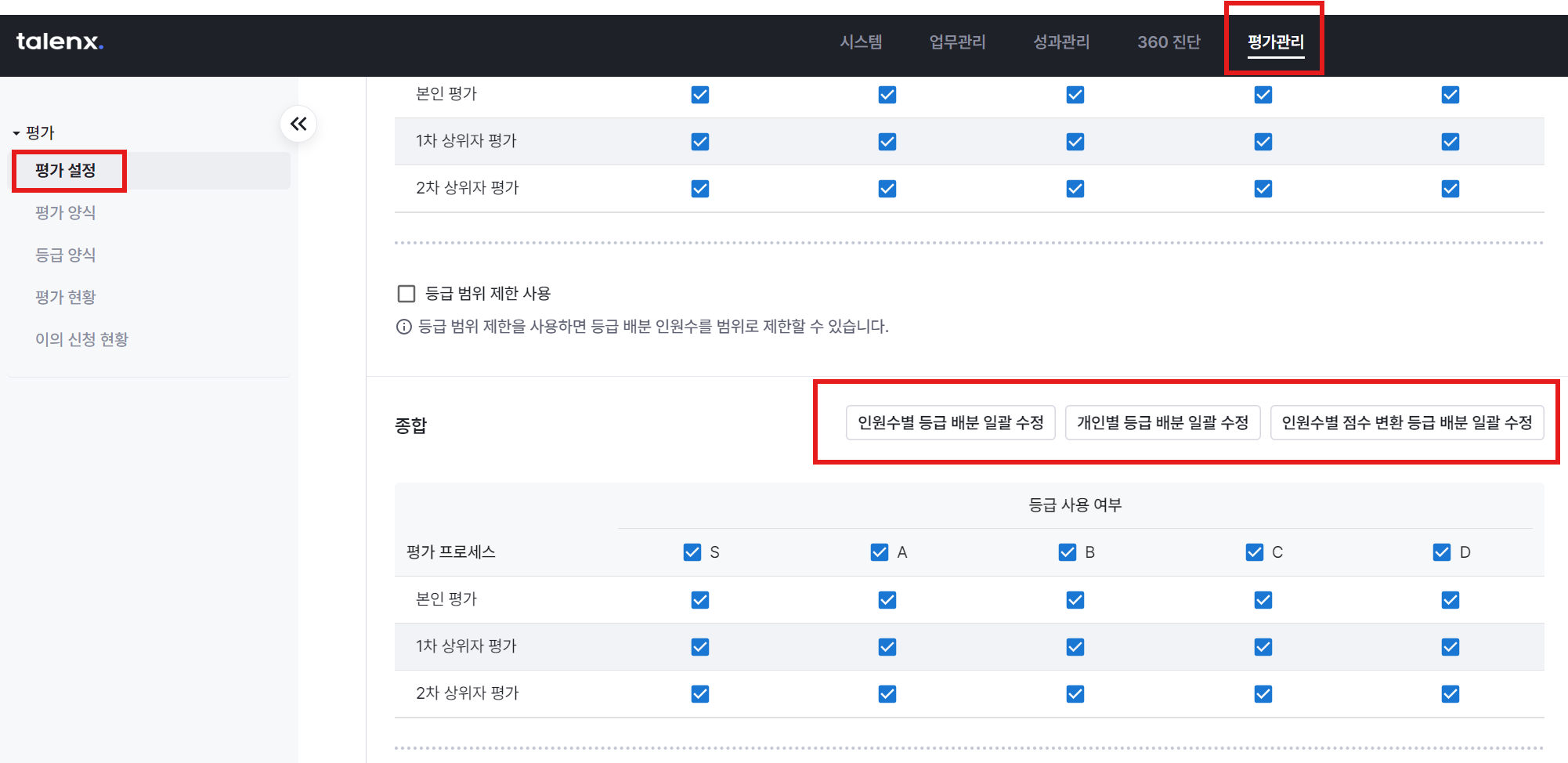 - 평가자에 따라 등급 배분을 설정합니다