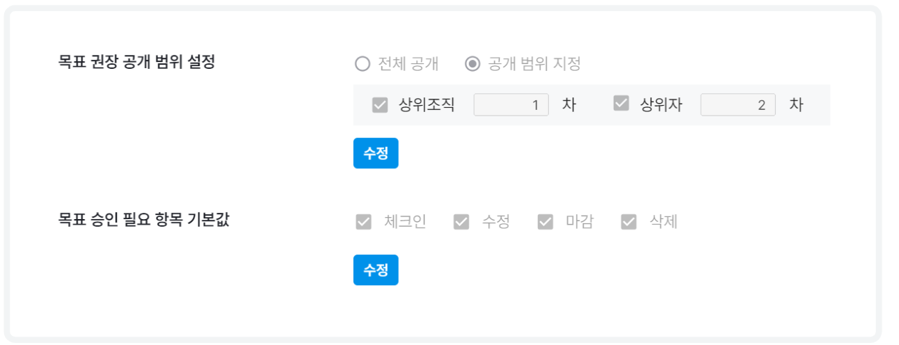 고급 설정을 활성화할 경우 사용자가 목표 공개 대상을 수정할 수 있으며, 비활성화 되어 있는 경우 어드민에서 설정한 디폴트 값대로 공개 범위가 설정됩니다.