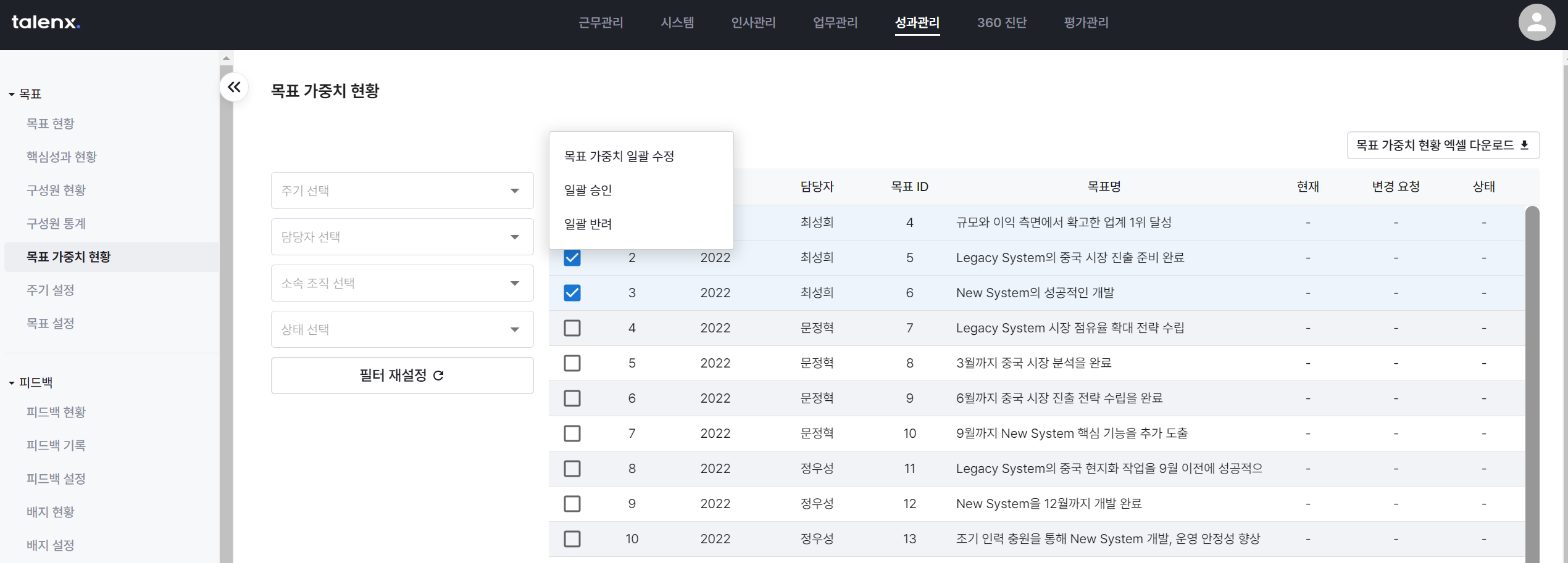 Admin > 성과관리 > 목표 가중치 현황 > 조정할 목표 선택 > 목표 가중치 일괄 수정