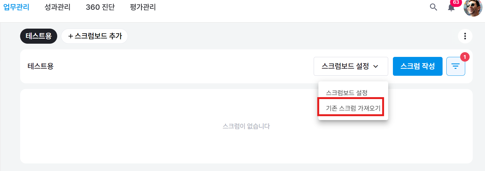 [스크럼보드 설정] > [기존 스크럼 가져오기] 버튼을 눌러주세요.