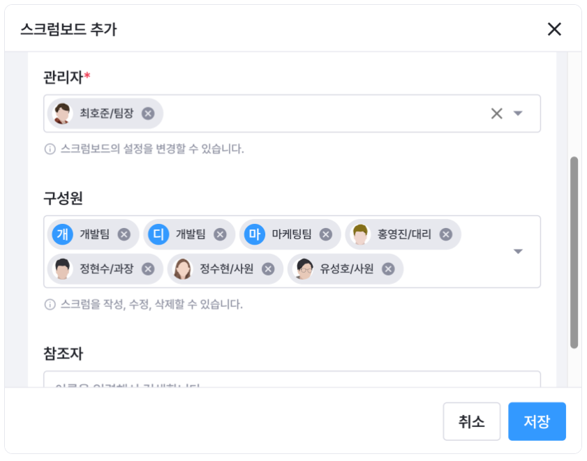 업무관리 > 스크럼보드 > +스크럼보드 추가 버튼을 눌러 주시면 새로운 보드를 추가할 수 있습니다. 스크럼보드의 관리자, 구성원, 참조자는 각기 다른 권한을 갖고 있어 원하는 대로 지정 가능합니다.