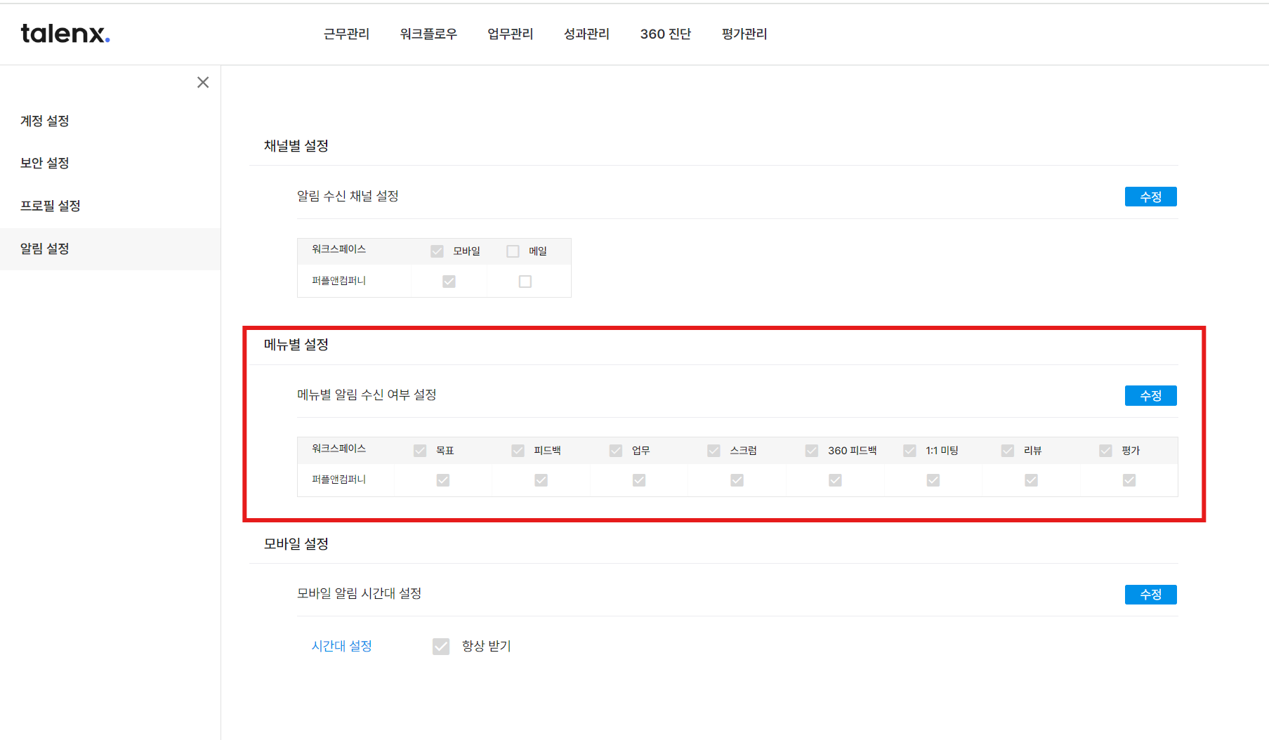 프로필 > 계정 설정 > 알림 설정 > 메뉴별 알림 수신 여부 설정