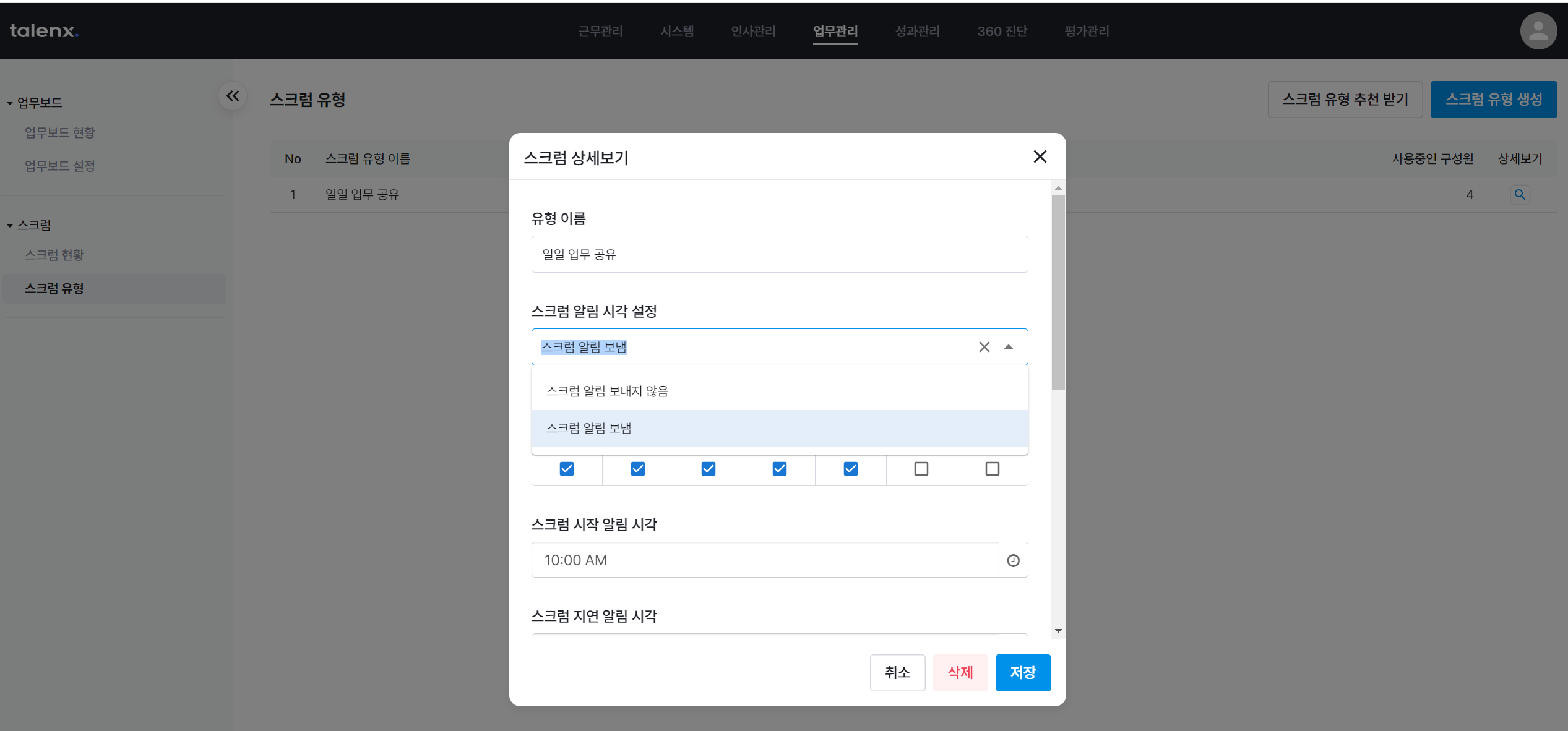 관리자 메뉴 > 업무관리 > 스크럼 유형 > 상세보기 > 스크럼 알림 시각 설정
