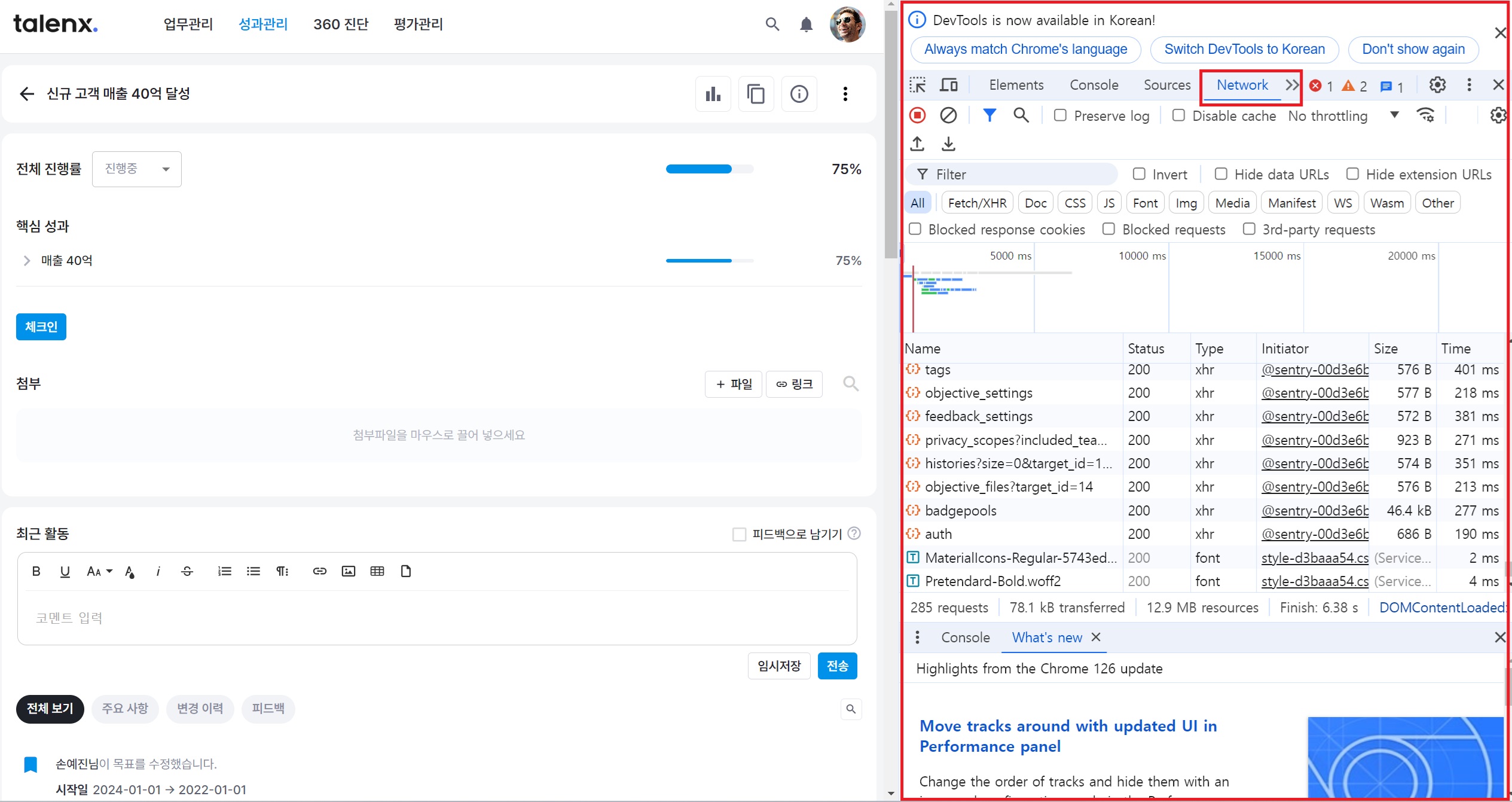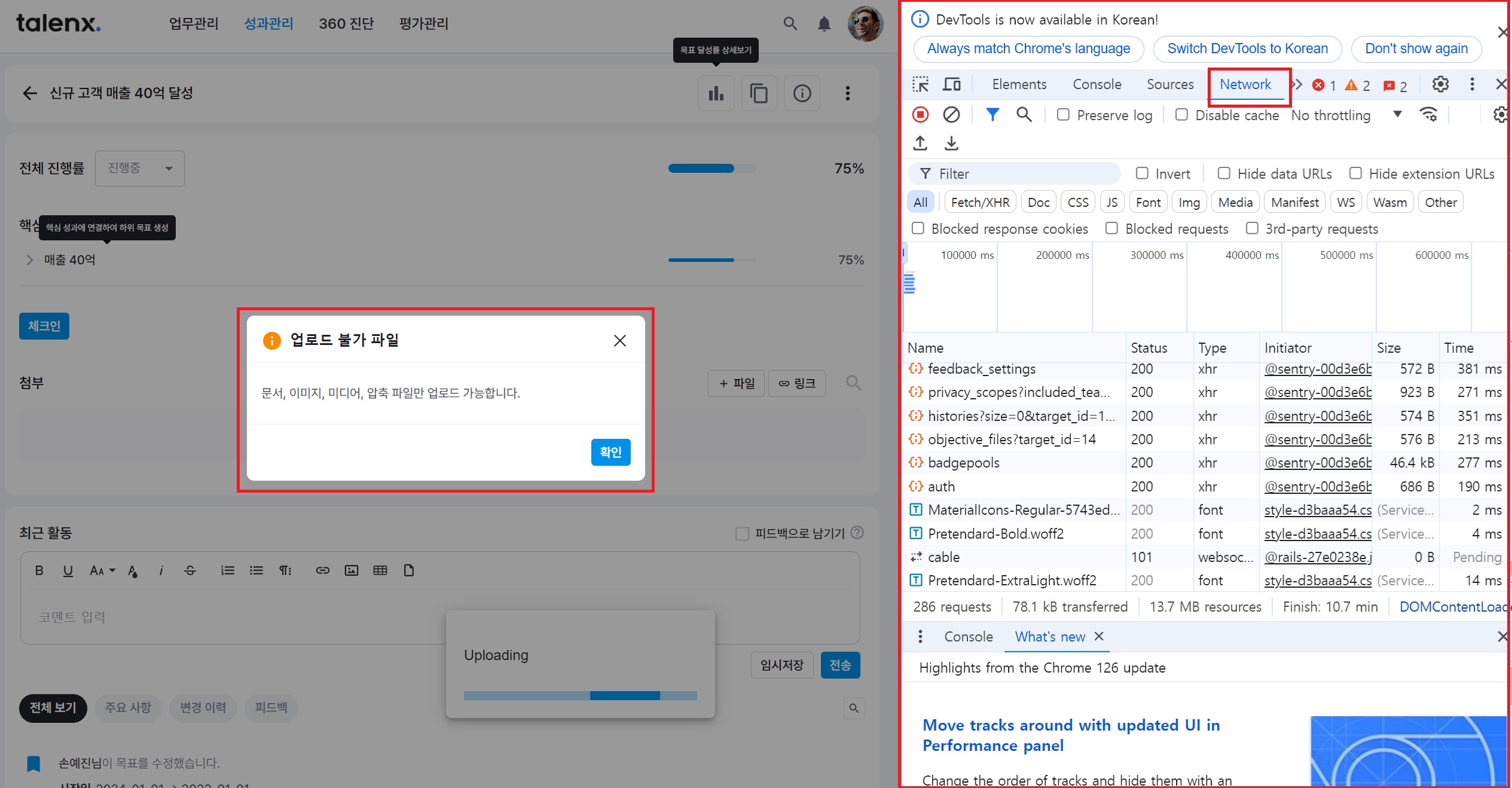 오류메시지가 나왔던 상황을 재현하여 오류 메시지와 함께 네트워크 창이 잘 나오게 캡쳐해서 보내주세요