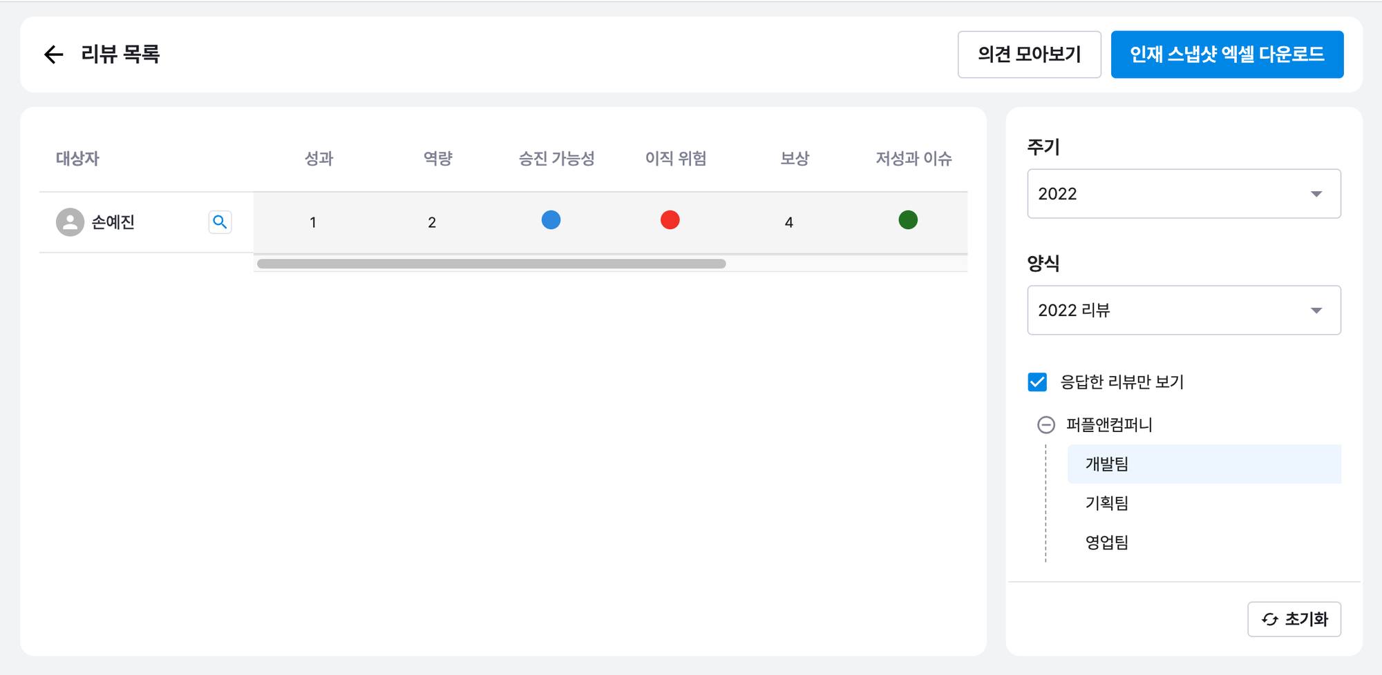 성과관리 > 리뷰 > 인재스냅샷 현황 > 응답한 리뷰만 보기