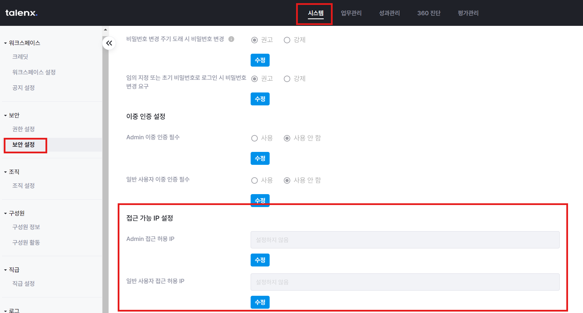 보안 > 시스템 > 보안 설정 > 접근 가능 IP 설정 을 통해 특정 IP의 접근만을 허용할 수 있습니다.