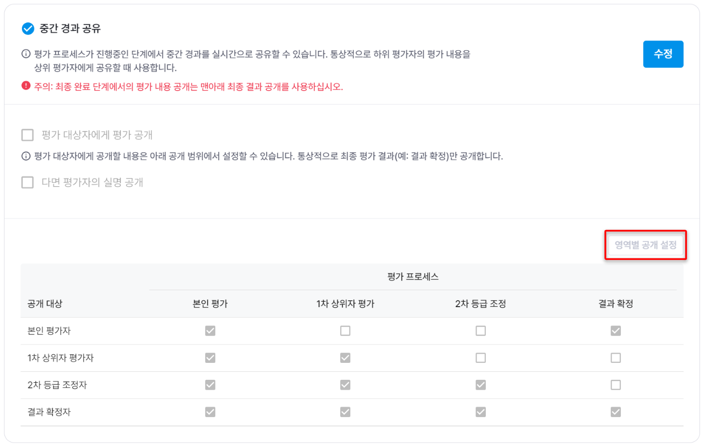 중간 경과 공유 기능의 경우 피평가자들에게 평가 입력창에서의 상세 내역을 공개하는 기능입니다.