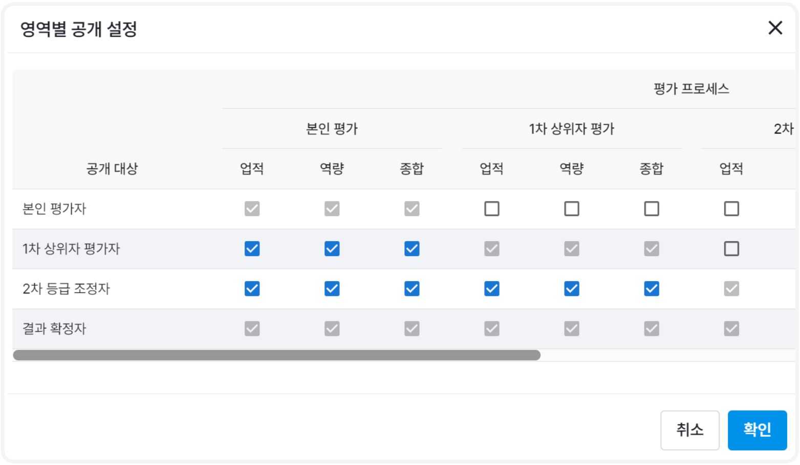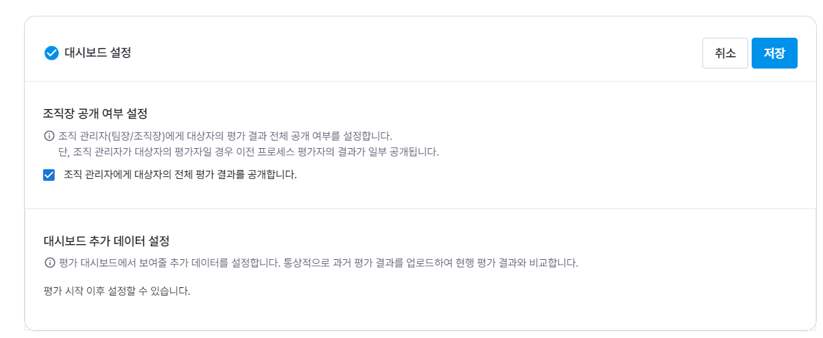 대시보드 설정에서 조직 관리자에게 평가 결과를 공개할 수 있습니다.