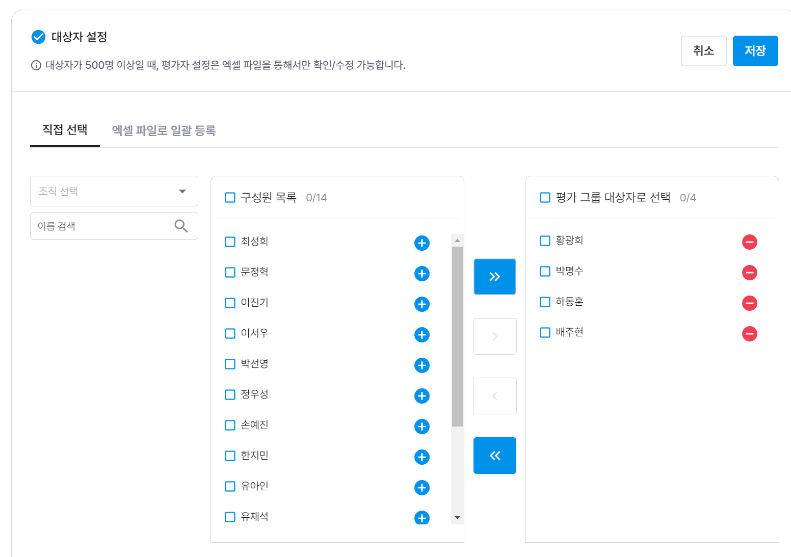 [그룹 1] 평가 대상자에서 피평가자 삭제 > [그룹 2] 평가 대상자에 피평가자 추가