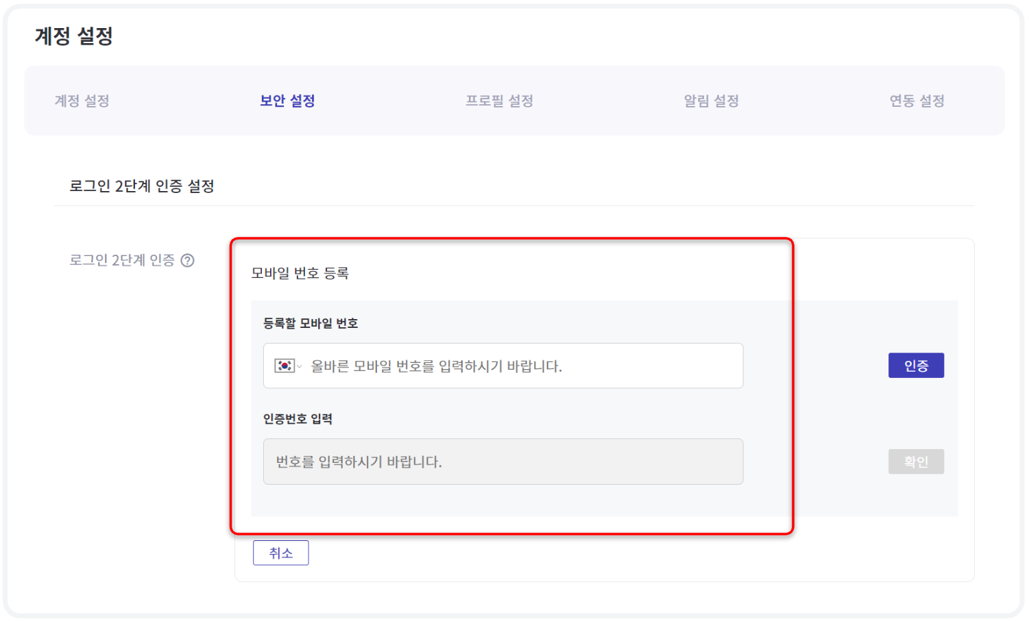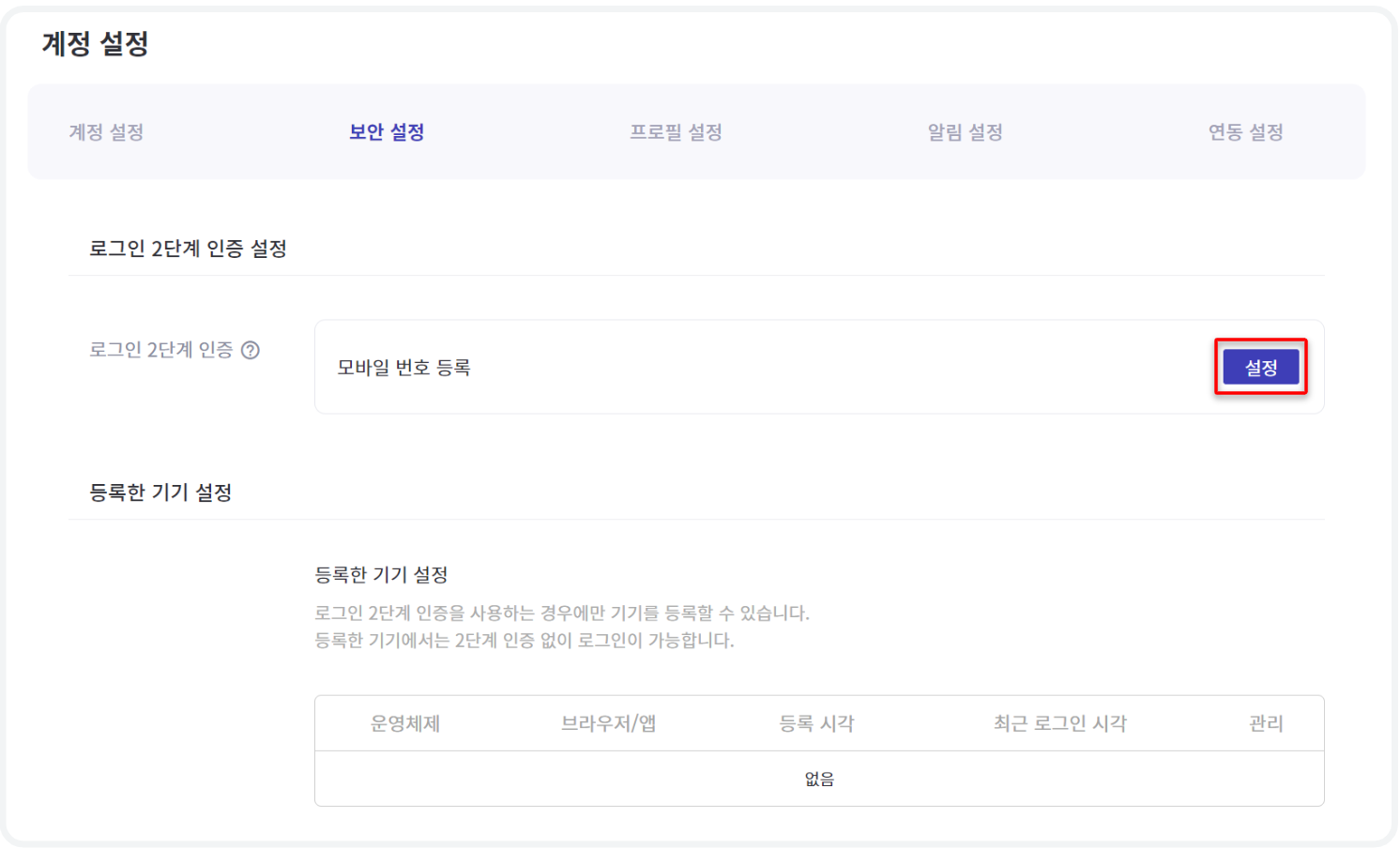 계정 설정 > 보안 설정에서 등록 가능합니다.