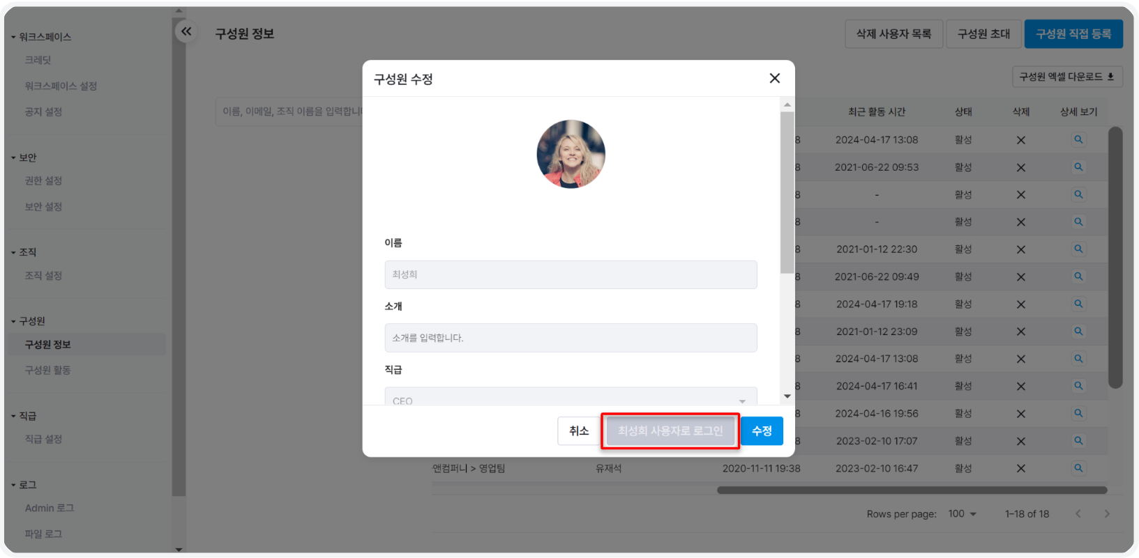 이후 필요 시 “보안 > HR Admin 로그” 확인해보시면 그간 HR Admin 활동 기록도 확인할 수 있으니, 보안 점검/감사 등에 활용하시면 되겠습니다.