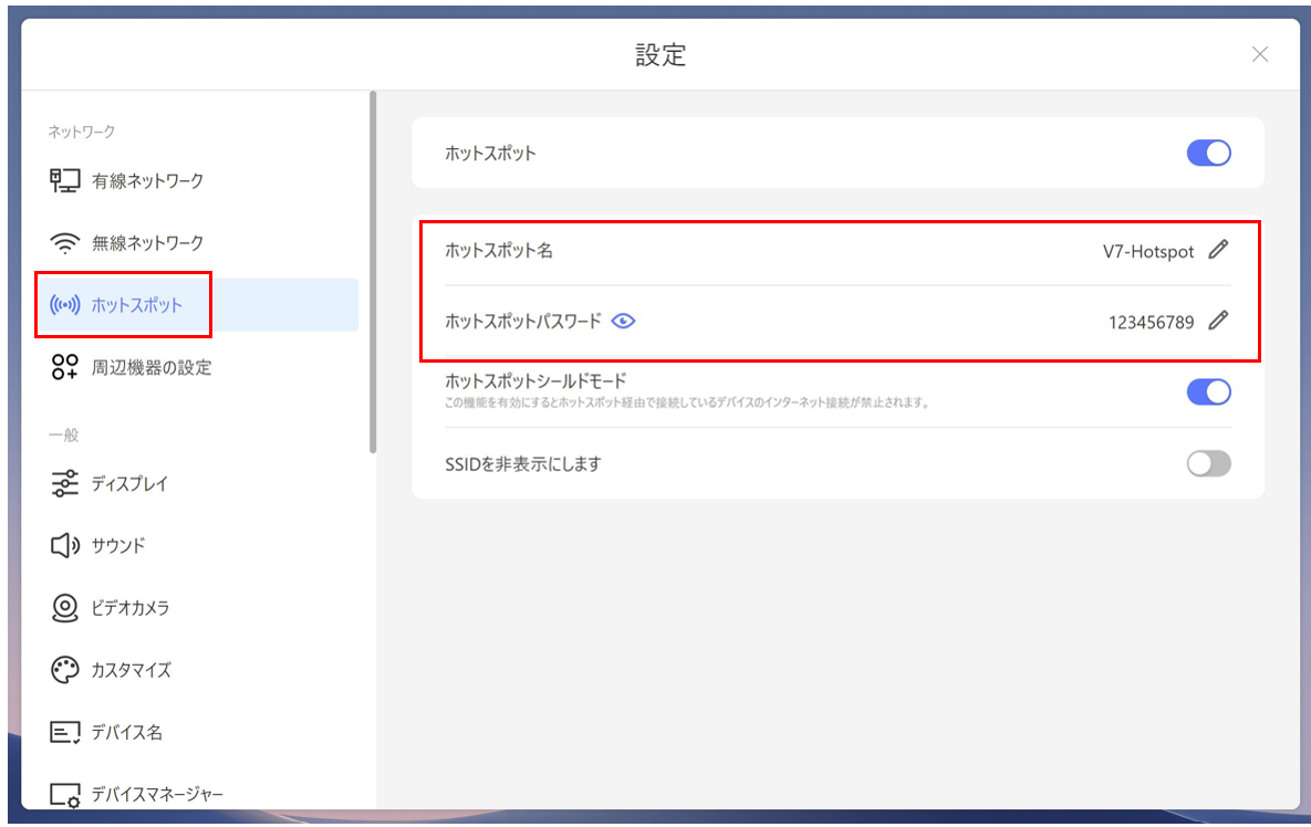 接続するミーティングボードの設定アプリから、ホットスポット名とホットスポットパスワードを確認してください。