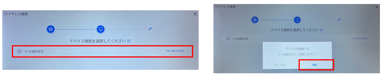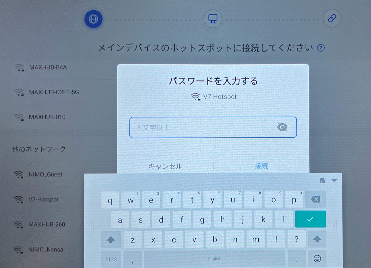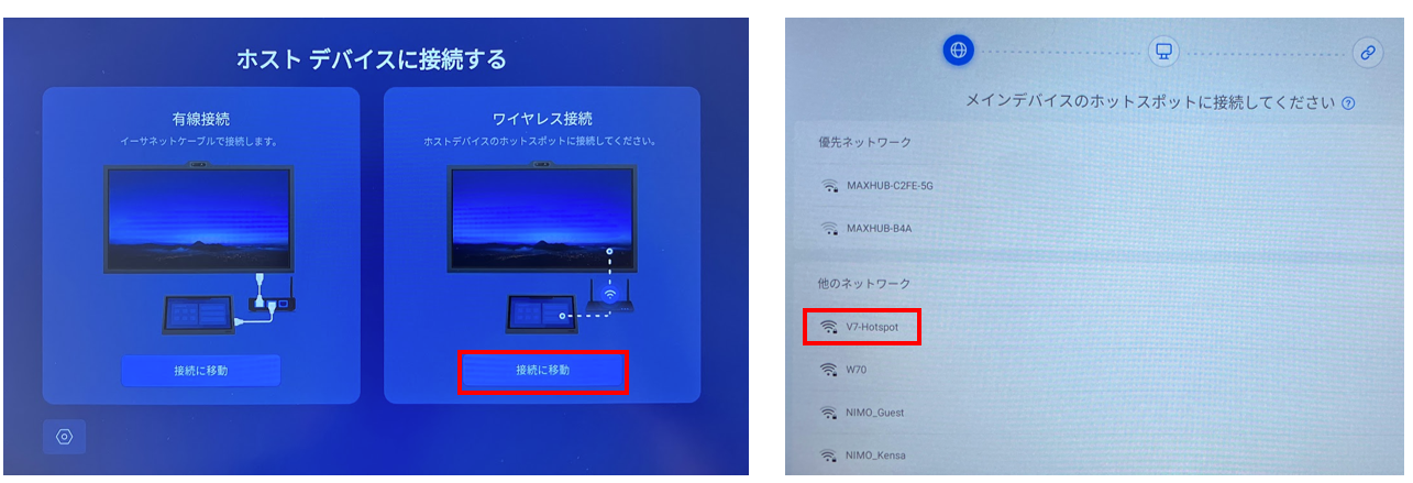 本機を起動し、ワイヤレス接続の[接続に移動]を選択し、接続するミーティングボードのホットスポット名を選んでください。
