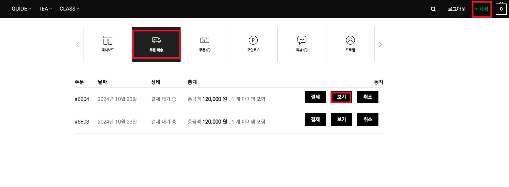 공식 홈페이지 로그인 후 상단의 내 계정 > 주문배송> 원하는 주문건 옆의 보기 버튼을 클릭합니다. 상단의 CG 또는 EG로 시작하는 번호가 운송장 번호입니다.