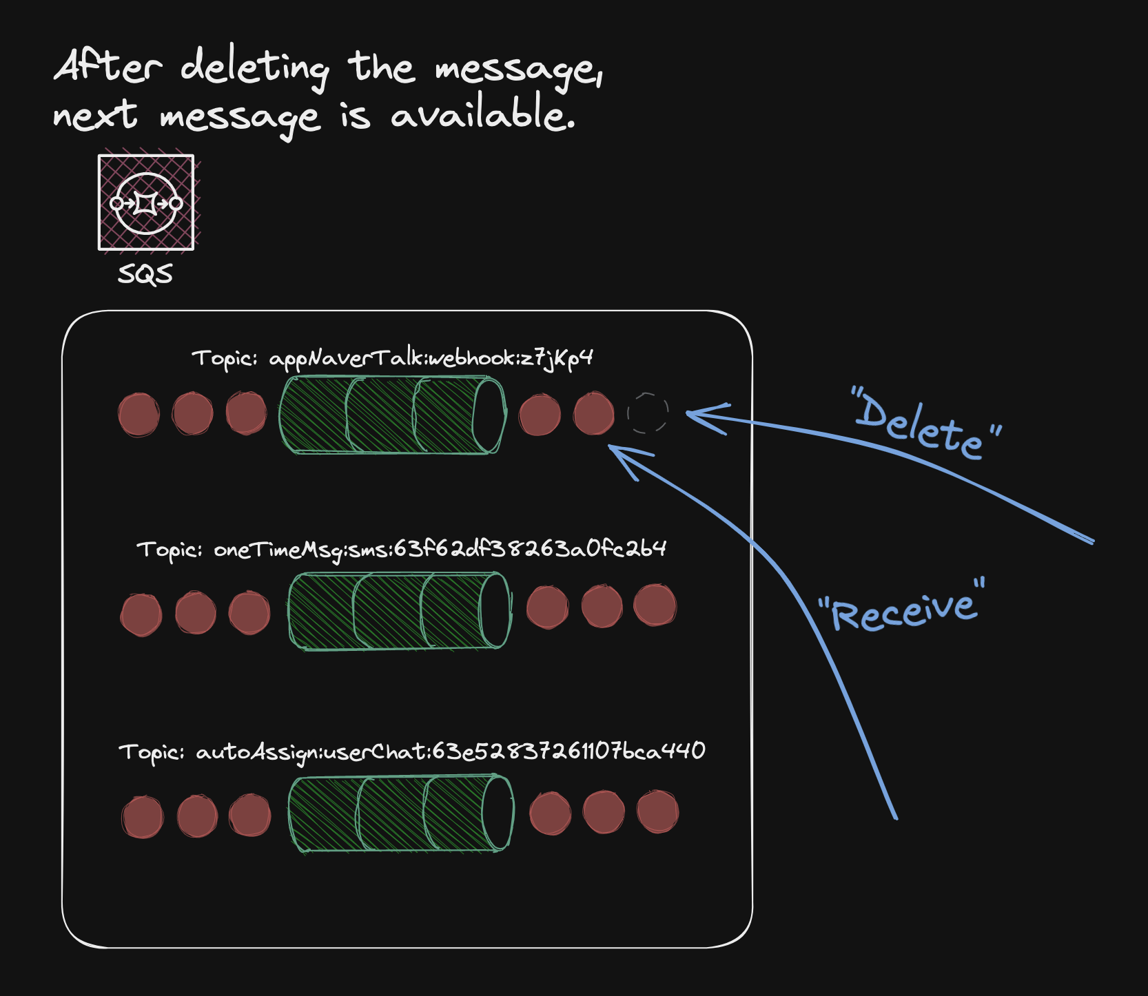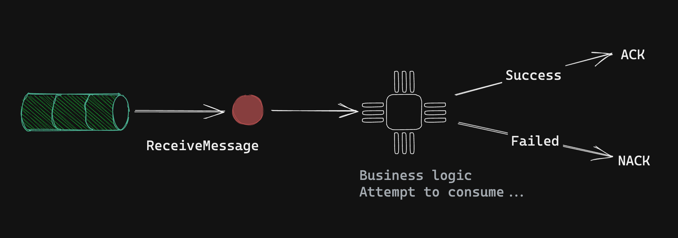 메시지를 queue에서 빼오는 것만으로는 SQS에서 메시지가 삭제되지 않습니다. 이 메시지를 처리한 후, 처리가 완료되었다(ACK)는 것을 SQS에 다시 요청해야 queue에서 메시지가 삭제되는 것입니다. 반대로, 메시지 처리가 실패한다면, 이 메시지 처리를 재시도할 수 있도록 SQS에 취소 요청(NACK)합니다.