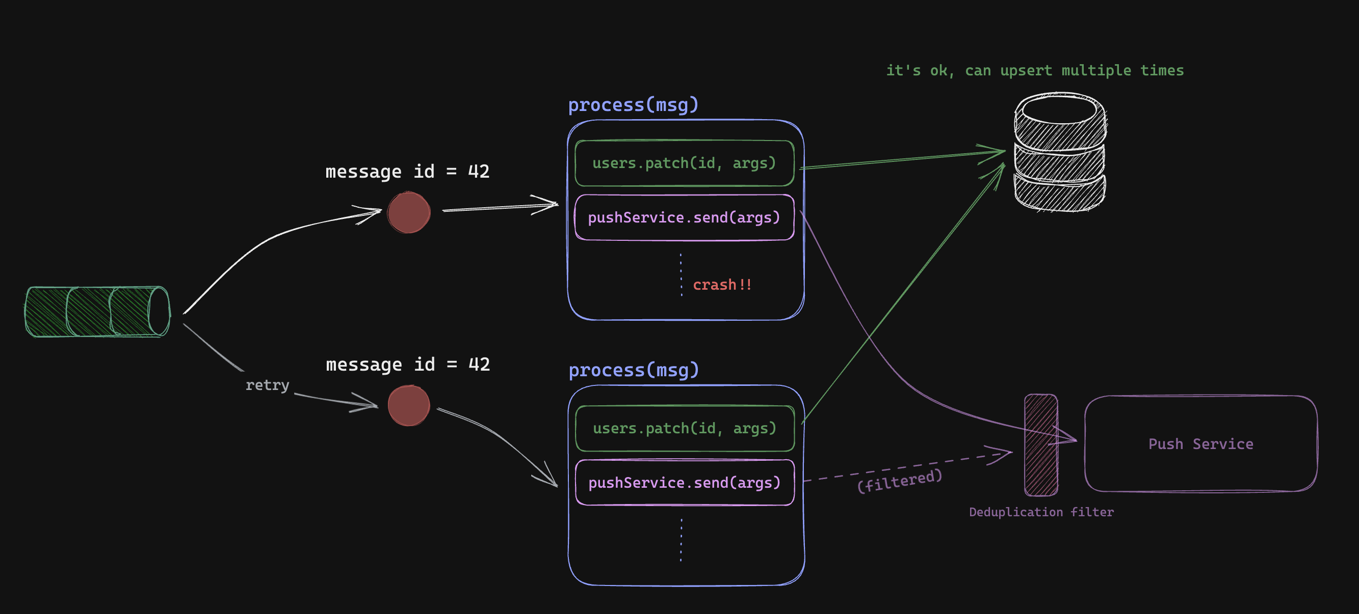 Consumer 프로세스가 죽는 경우를 고려하면, 메시지 하나를 받고 처리하는데 process(message) 를 끝내고 죽어버리거나, process(message) 도중에 죽는 경우가 있습니다. 비즈니스 로직에서 의도했던 side effect가 모두 성공했지만 이 메시지가 ACK 되지 못해 다시 처리되거나, side effect 중 일부만 처리되었을 수 있다는 의미입니다. 메시지를 처리하는 비즈니스 로직과 SQS에 ACK을 보내는 것을 atomic하게 묶지 못하기 때문에 발생하는 일입니다. (이것을 완벽하게 처리하려면, 2PC와 같은 메커니즘이 필요하죠) 즉, 비즈니스 로직은 한 메시지를 여러 번 처리할 수도 있음을 염두에 두어야 합니다. 데이터베이스에 item을 upsert하는 행위는 멱등성 있으므로, 중복해서 메시지가 처리되어도 관계 없습니다. 하지만 사용자에게 푸쉬 메시지를 보내는 행위는 그렇지 않습니다. 이 경우에는 중복 제거 필터를 통해 한 메시지가 여러 번 queue에서 consume되어도 관계 없도록 대응해주어야 합니다.