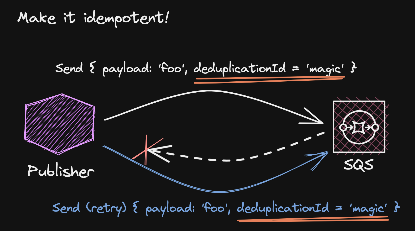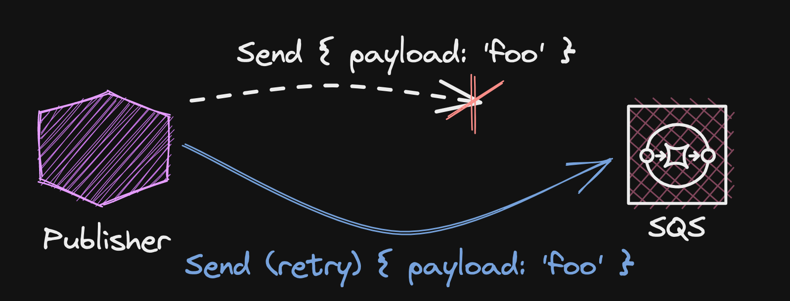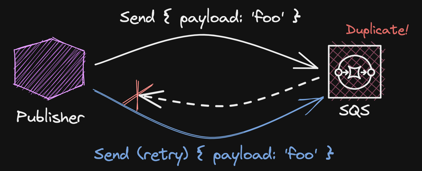 메시지가 publish되다가 실패했을 때, 이것은 SQS에 메세지가 도달하지조차 못한 것인지, 아니면 SQS는 메시지를 받아서 publish하는 데 성공했지만 response를 받지 못한 것인지 구별할 수 없기 때문입니다. 이것은 네트워크를 통해 통신해야 하는 서비스 간에 흔히 발생하는 문제입니다.