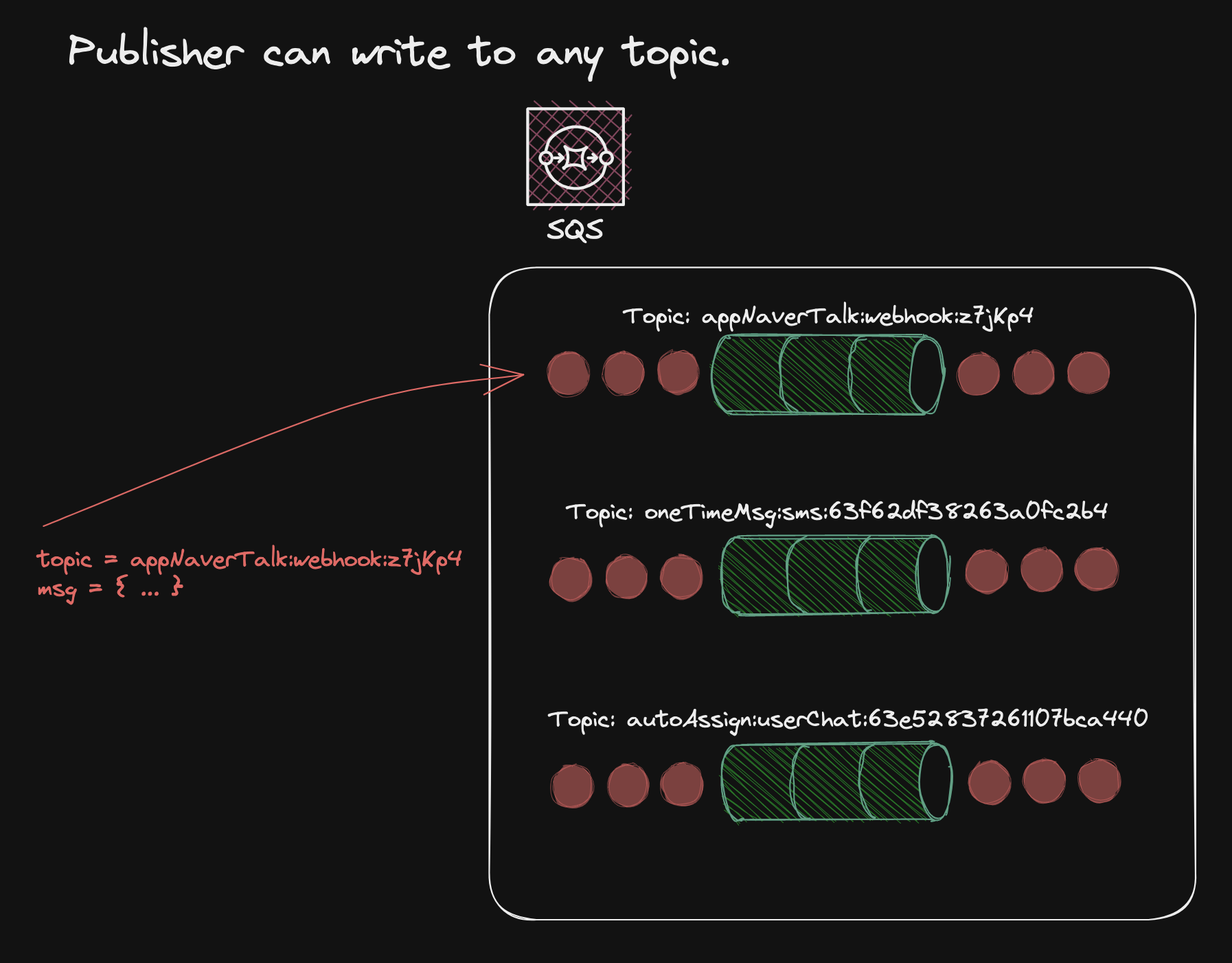 위 그림은 SQS의 mental model입니다. Topic (message group) 마다 논리적인 queue가 존재한다고 생각하면 편리합니다. 하지만, 실제로 물리적인 queue가 provisioning되는 것은 아닙니다. SQS는 따로 등록 없이 message를 publish할 때 새로운 message group을 지정할 수 있고, message group은 무한히 많이 만들 수 있기 때문입니다.