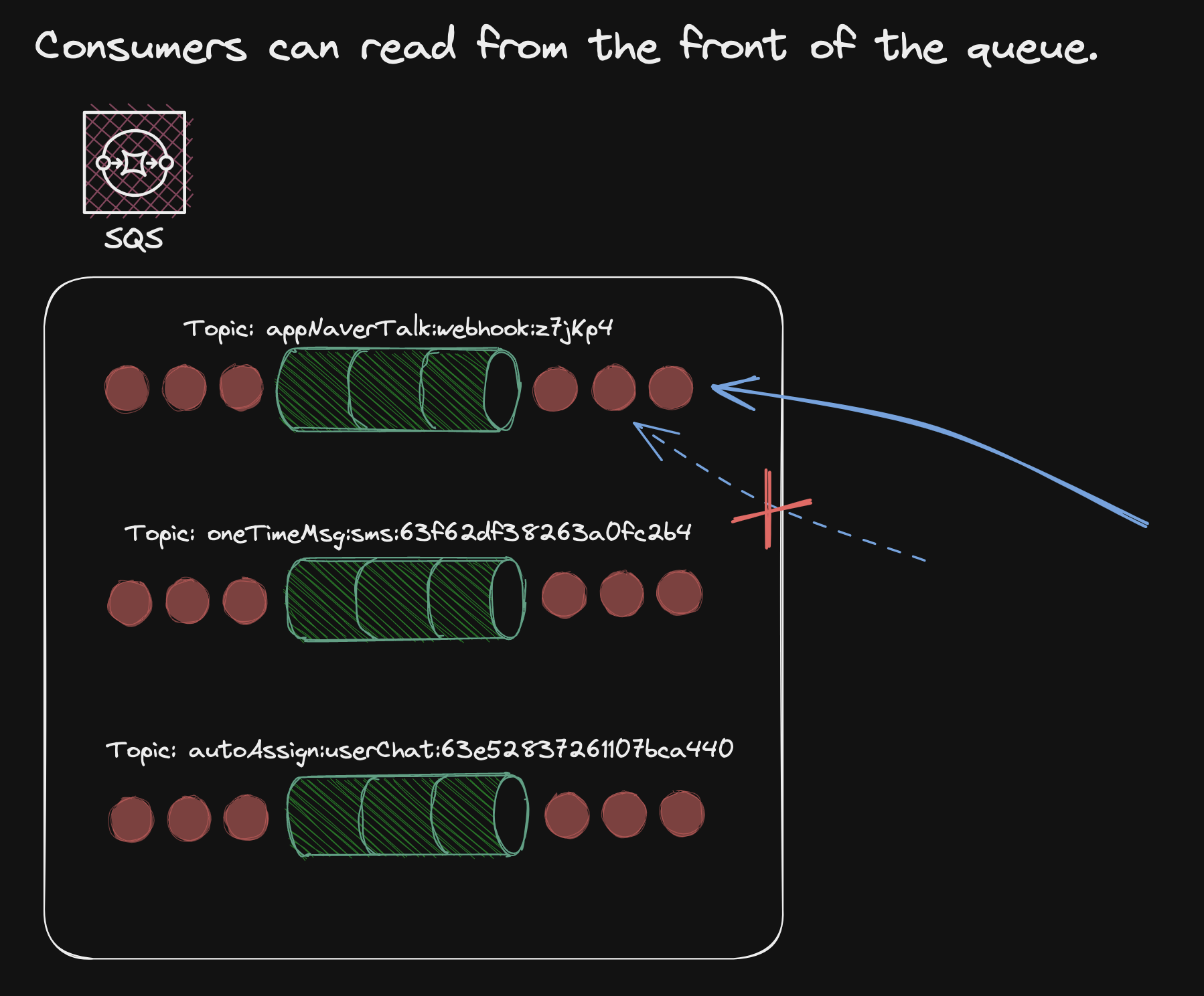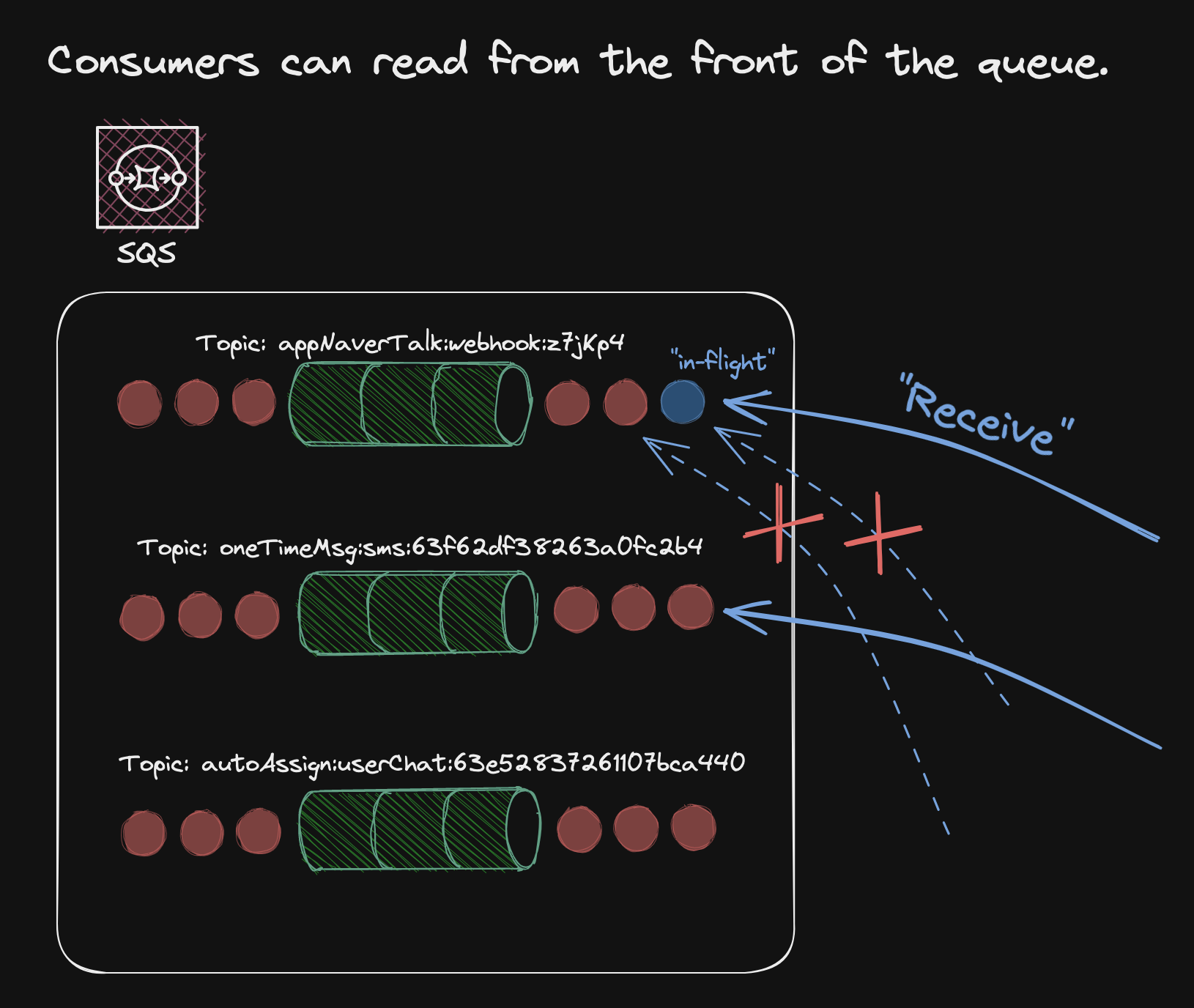 SQS에서 같은 message group에 있는 메시지는 논리적인 FIFO queue에 묶여 있다고 언급했습니다. 따라서, 한 message group에서는 가장 앞에 있는 메시지 하나만 읽을 수 있습니다.