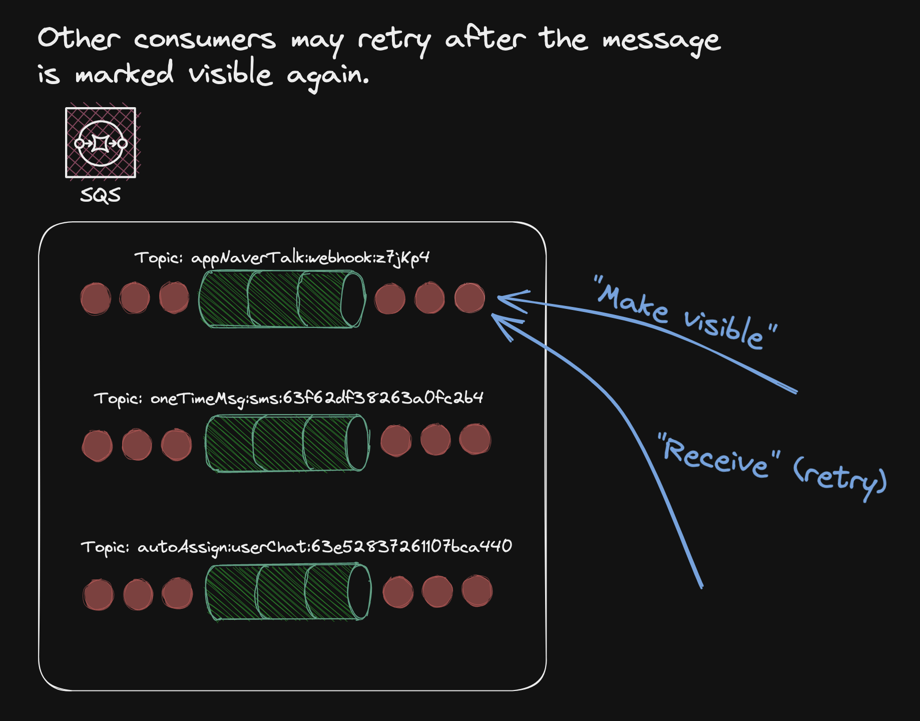 따라서, 메시지를 받을 때는 consumer가 대답해주는 것에 의존하지 않고 이 메시지를 어떻게든 처리할 수 있는 fallback 수단이 필요함을 알 수 있습니다. SQS에서는 메시지를 받을 때 VisibilityTimeout parameter를 넣을 수 있는데요, 이것은 이 메시지에 대해 ack 또는 nack을 받지 않더라도, VisibilityTimeout 이 지나면 이 메시지는 기다리고 있는 상태에서 해제된다는 것을 의미합니다. 그러면, 이 메시지를 처리하던 process가 죽어버려도 timeout이 지난 다음에 다시 살아난 process가 재시도할 수 있겠죠.